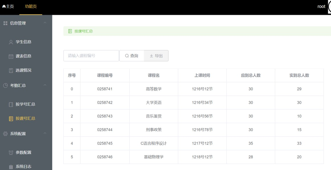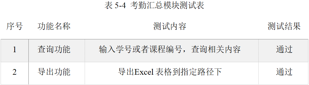考勤汇总页面如图 5-2 所示,系统从学生和课程的角度分别展示某教室一学期的签到概况,包含课程应到、实到总数、学生答到状态等。引入 EasyExcel 框架简捷实现固定 sheet 和表头的表格导出功能,导出效果如图 5-3 所示,教务管理者可以根据需求下载考勤数据并导出 EXCEL 格式表。通过页面操作测试模块功能,测试结果见表 5-4。