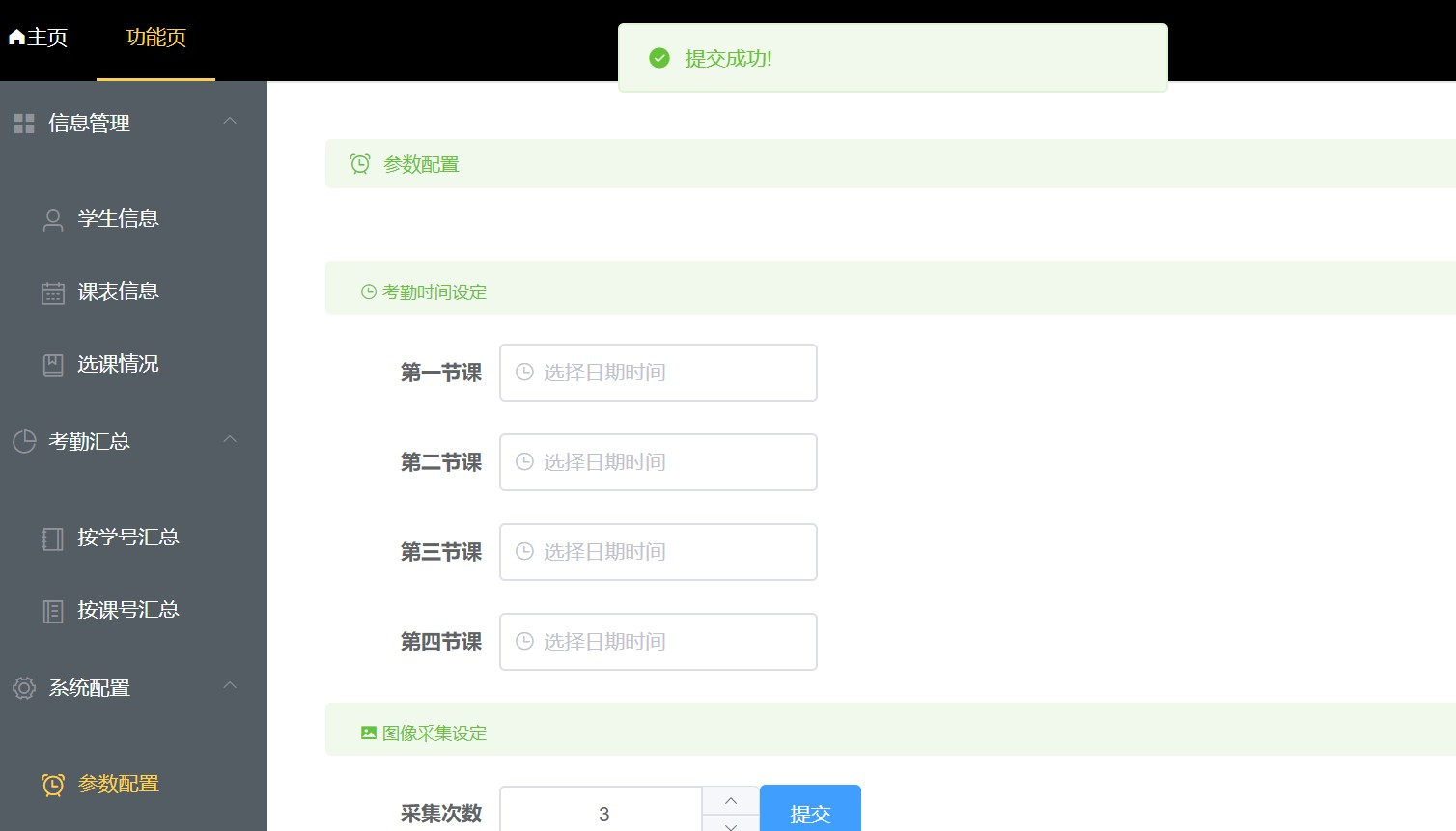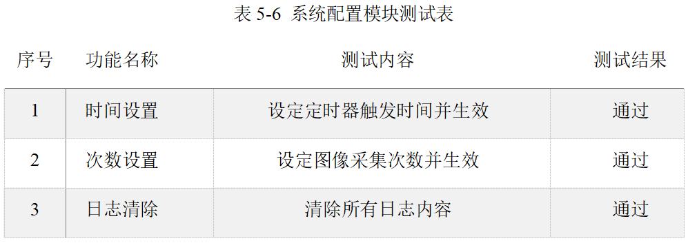 系统配置页面如图 5-5 所示,教务管理者可以查看日志内容以及设置考勤时间和图像采集次数。采用 Spring 框架来解决定时器时间设置和获取的问题,把设定的时间存储在数据库中并根据定时器状态来实时获取时间、次数等参数。为了保证定时任务的执行,通过设定所有定时器为生效状态来应对课程变化情况,即便是教室无课也会触发定时器但不影响考勤统计结果,从而避免了动态生成定时任务的问题以及频繁设置考勤时间的困扰。对部分功能测试,内容见表 5-6。
