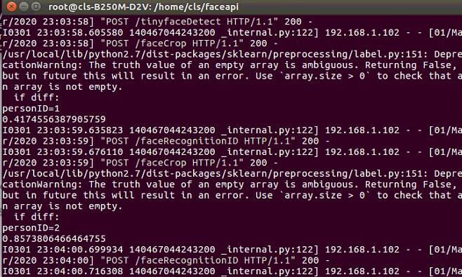这个模块主要涉及小人脸检测、人脸识别和服务交互三个部分,检测效果如图5-7 所示,由绿色方框表示检测置信度较低的人脸,黄色窗体表示检测置信度较高的人脸,服务器识别反馈如图 5-8 所示,图中 personID 指识别人员标识,标识下面为阈值,阈值越小,准确度越高。识别反馈主要有人员 ID 及阈值,结果经处理直接存储在数据库中,无须前端页面展示,故用命令行交互窗口展示识别功能测试结果。后端用 Base64 编码采集结果并用 Post 请求方式调用小人脸检测算法,用MultiValueMap(一键多值映射类型)接收检测的结果并提取检测总人数。若有未识别人员的存在,则依次调用人脸对齐、识别算法,最后用 Map(一键单值映射类型)接收识别反馈结果。对部分功能测试,内容见表 5-9。