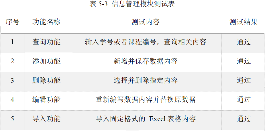 信息管理页面如图 5-1 所示,教务管理者可以浏览学生信息、课表信息以及选课页面的内容,通过页面操作来测试模块基本功能,测试结果见表 5-3。