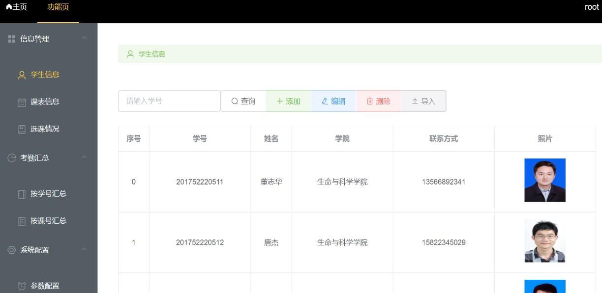 通过框架设计和算法分析,在实现微小人脸算法的基础上,构建了一个考勤管理系统。这个系统包含核心功能模块:图像采集、考勤统计和小人脸识别模块,三者的互相协作完成了自动化考勤方式。还包含了其他功能模块,如注册登录、信息管理、系统配置等模块。系统的管理平台从简单实用的角度出发,用 Vue 前端框架实现了可交互式界面。不仅给教务管理者一个可视化数据展示平台,也能完成对学生、课表、考勤、参数的基本操作。最后,整个系统在测试使用中运行良好。