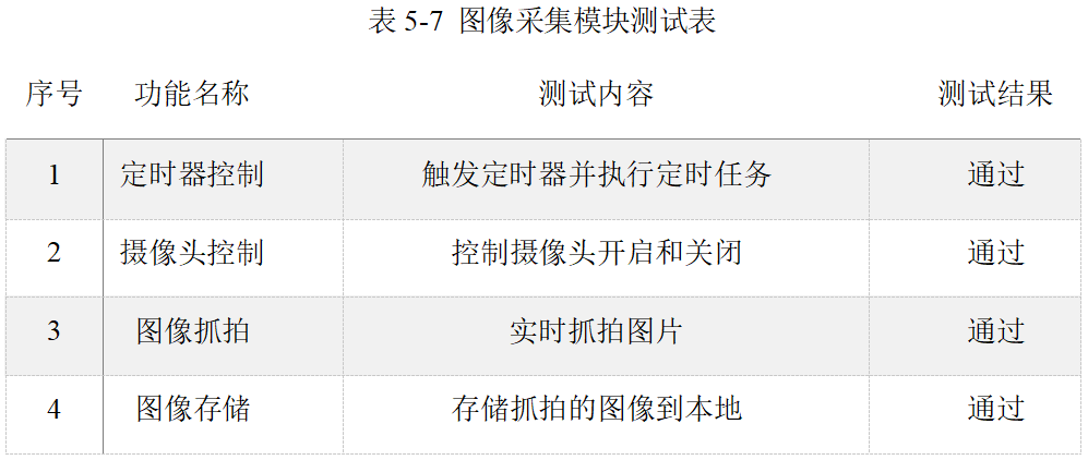 这个模块主要涉及到摄像头控制、定时器触发以及图片获取等,Spring 支持Timer、Quartz 等多定时框架[39],其中 Quartz 复杂性最大、成本高,适用于多变的定时任务,而 Timer 的时间设定不够灵活,本文采用 Spring 自带的 SpringTask 定时器,通过注解的方式引入定时器,传入定时任务( Runnable) 和定时时间(CronTrigger)的参数,定时器启动后,Spring 容器会自动扫描定时任务,根据定时时间来执行指定任务。利用开源视觉库JavaCV[40]来实现摄像头控制和图像获取,通过 JavaCPP 间接调用 OpenCV 的库接口直接获取当前设备信息,相比于多媒体框架 JMF,JavaCV 在摄像头启动时无须预热,使用帧抓捕器直接获取视频帧。核心代码如图 5-6 所示,需要对各部分进行功能测试,测试内容见表 5-7。