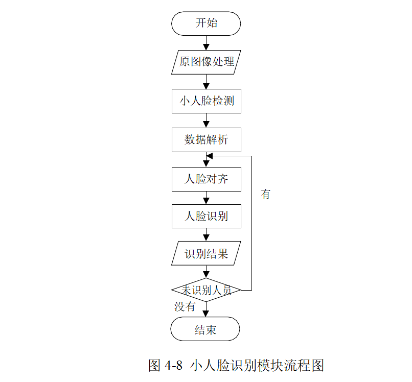 小人脸识别是考勤系统的核心模块之一,完成识别学生身份的功能。这个模块主要涉及到原图像处理、数据解析、小人脸检测、人脸对齐以及人脸识别等内容。小人脸识别流程如图 4-8 所示,系统按所需格式预先处理采集的图像,再调用小人脸检测算法,算法处理后,检测结果的先经过解析和提取,系统输出检测的总人数并且依次调用人脸对齐和人脸识别算法,算法输出识别结果后,判断是否还有未检测人员,如果有,则继续对齐和识别,直到所有检测到的学生都识别结束为止。