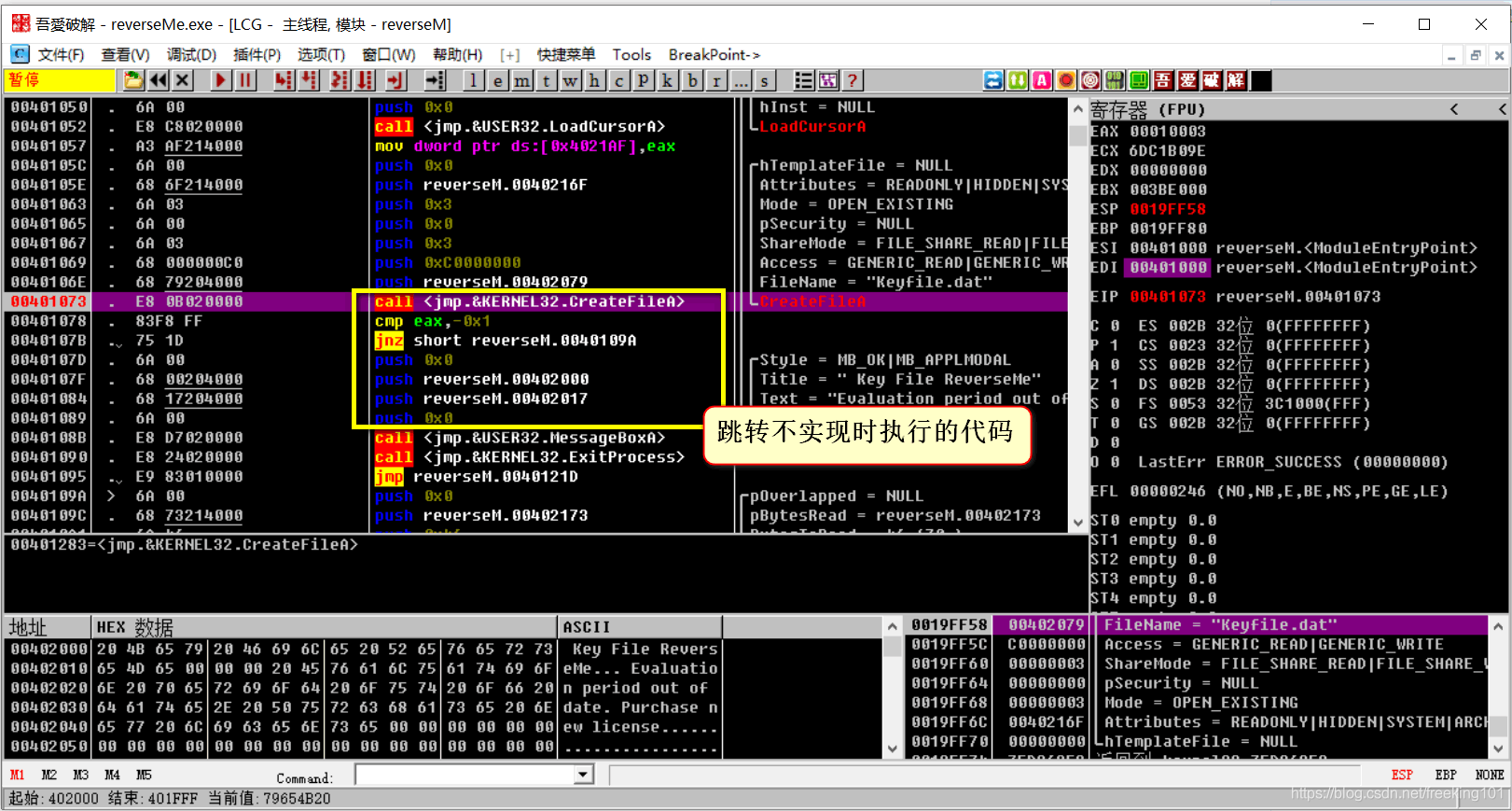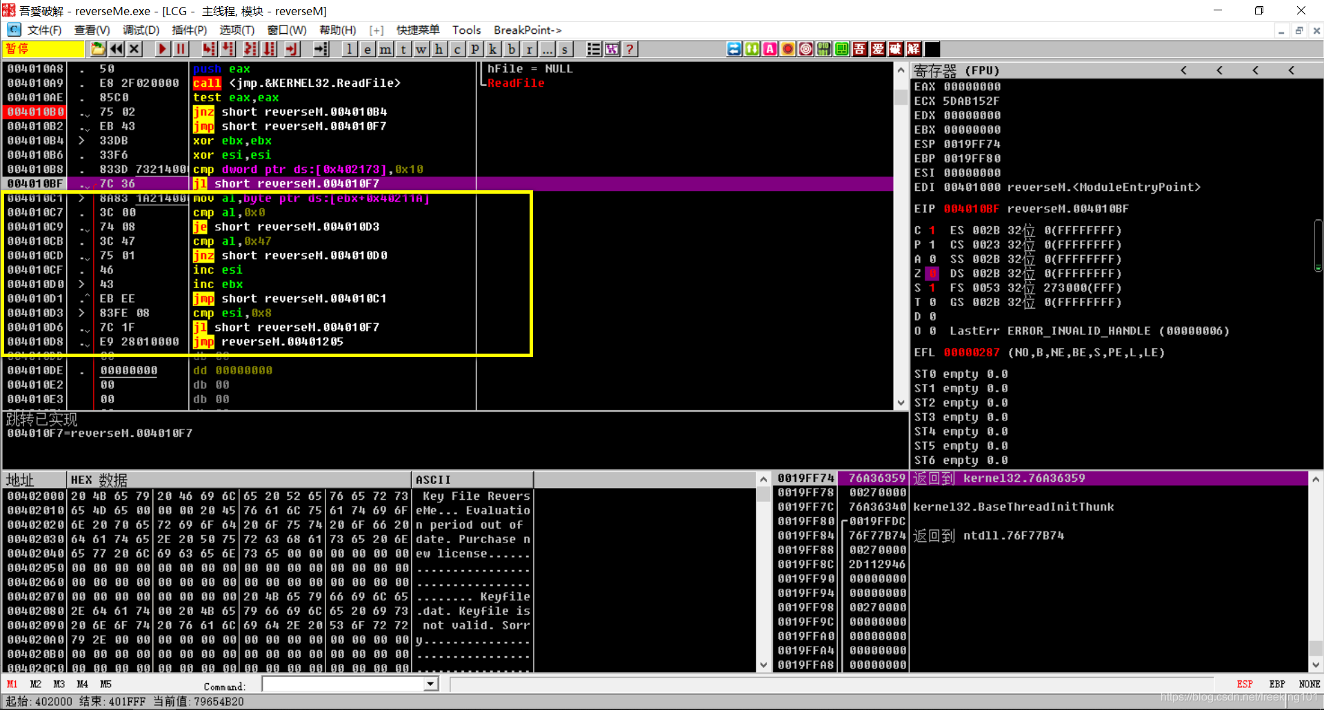 继续走我们的程序,我们又遇到一个跳转已实现的,分析到下面的代码,发现会跳转到密钥区,所以我们继续让他不实现。看他的条件语句: