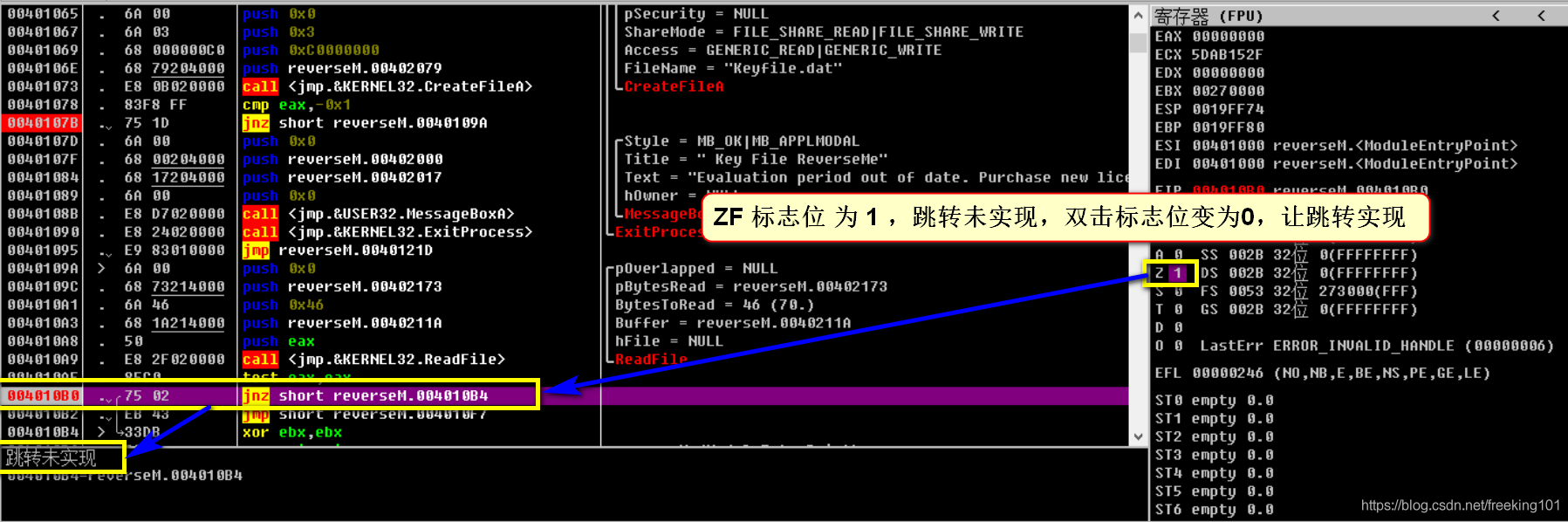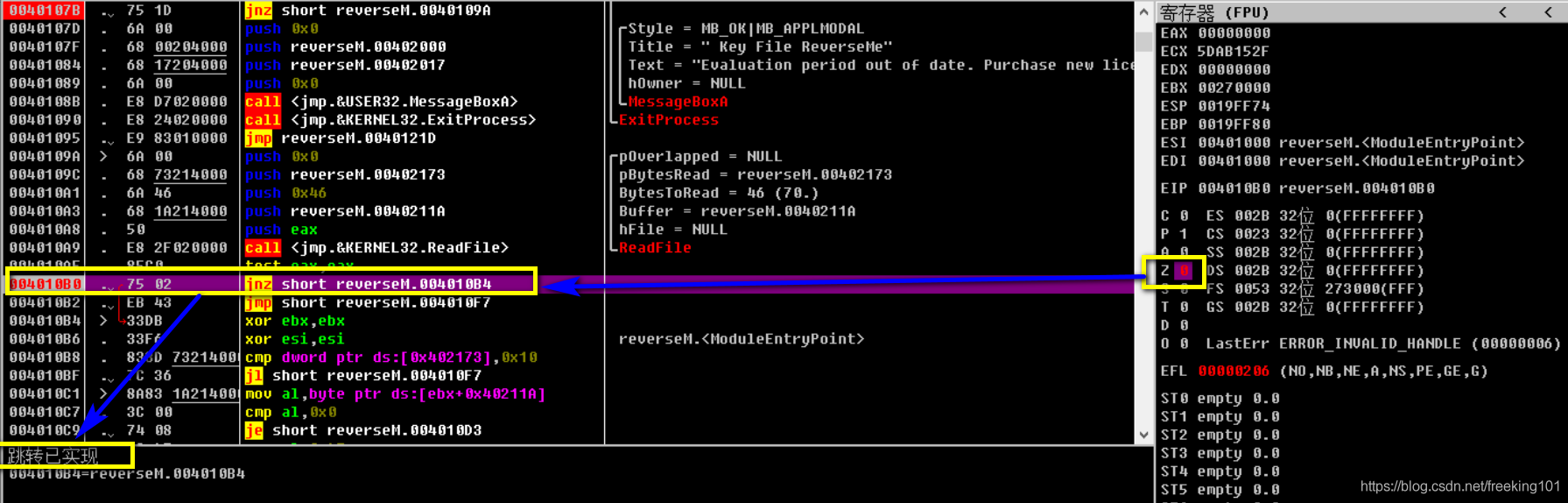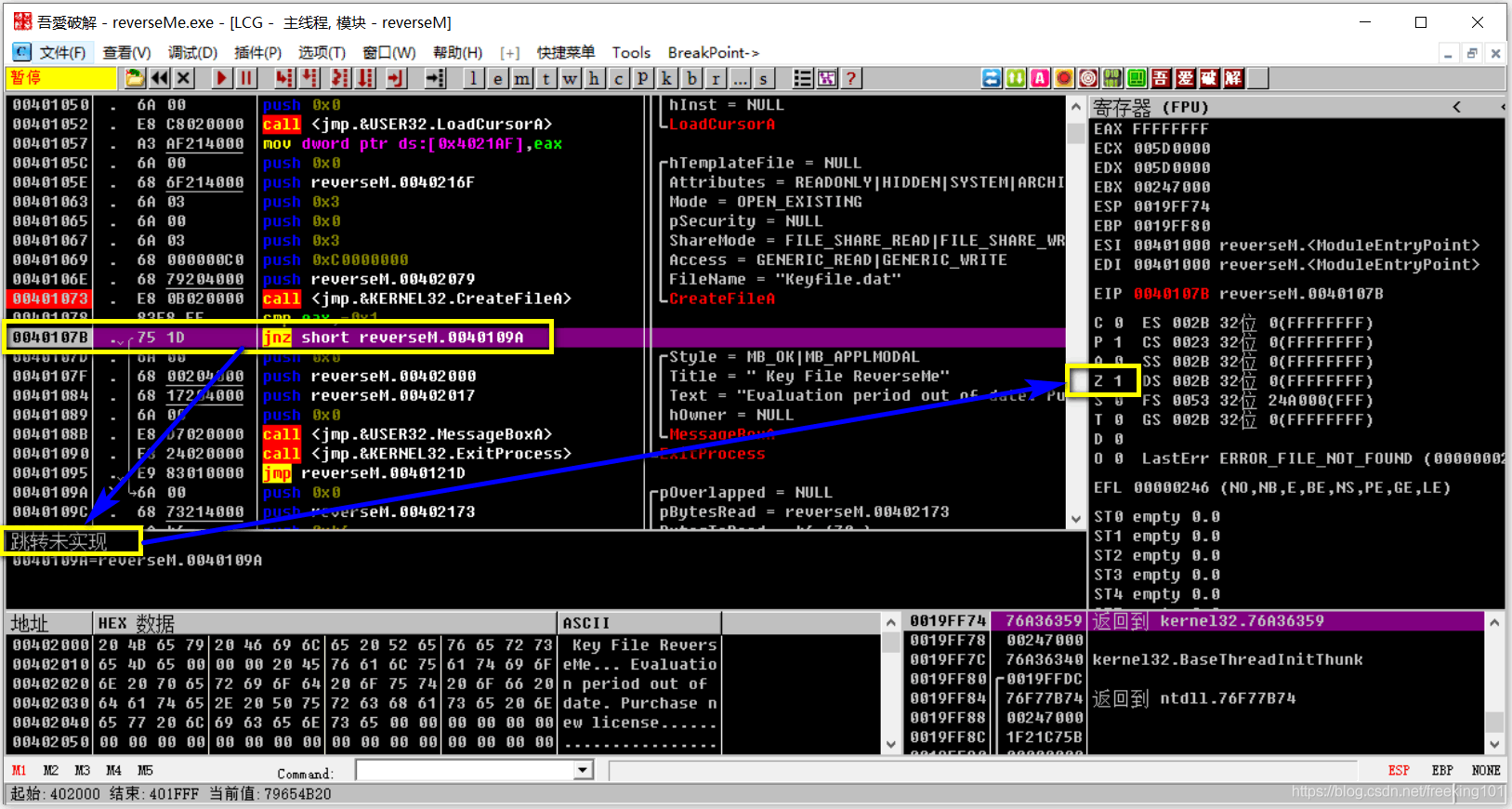 我们又遇到一个跳转未实现的值,其实在这里也是一个坑来的,那我们和上面一样,让他跳转的值实现。同样把寄存器区的Z值修改为 Z=0 从而达到跳转的效果。