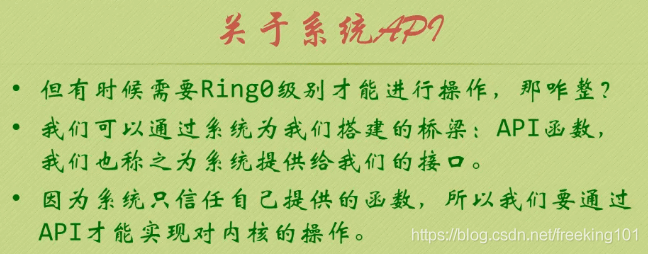 API 函数,我们也称之为系统提供给我们的接口。因为系统只信任自己提供的函数,所以我们要通过 API 才能实现对内核的操作。