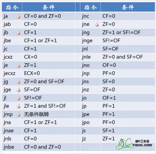 条件跳转指令,就是根据各种不同标志位的条件判断是否成立,条件成立则跳转。