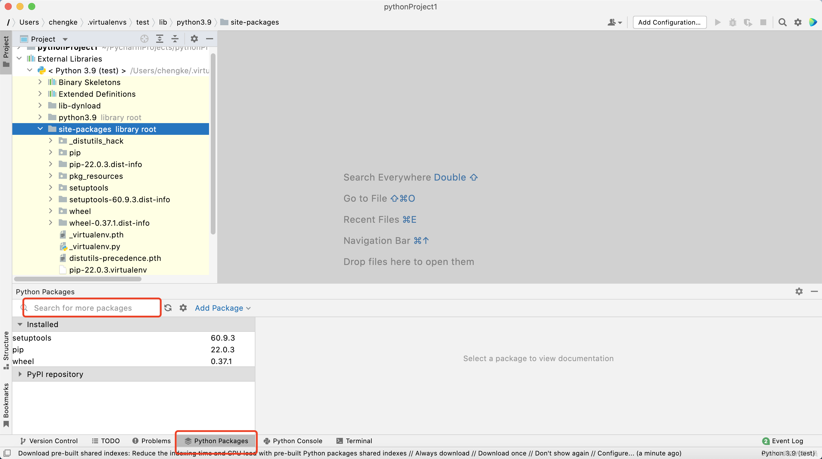 虚拟环境安装python相关包可以在下图搜索框中搜索安装,也可以使用虚拟环境中的pip install安装。需要注意的是pip如果已经配置了全局的环境变量,那么需要使用虚拟机环境中pip的绝对路径来执行。