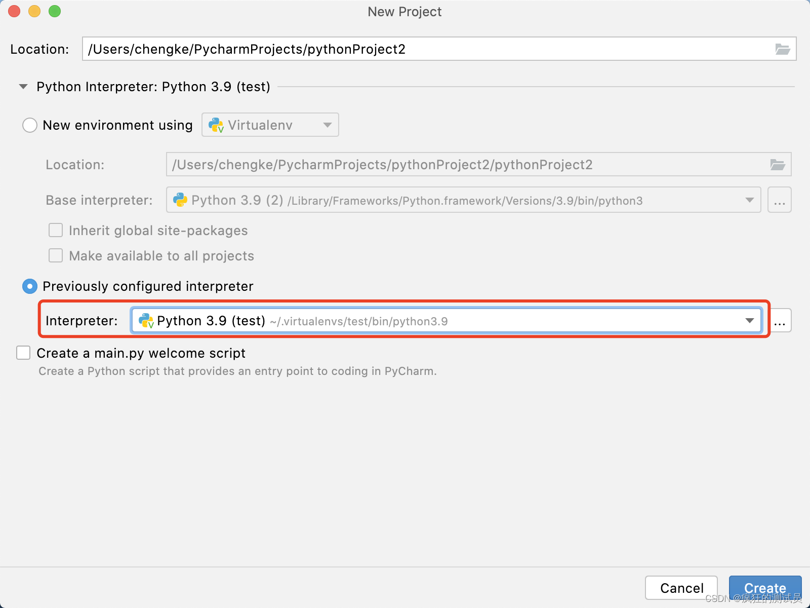 mkvirtualenv test -p /usr/local/bin/python3.9