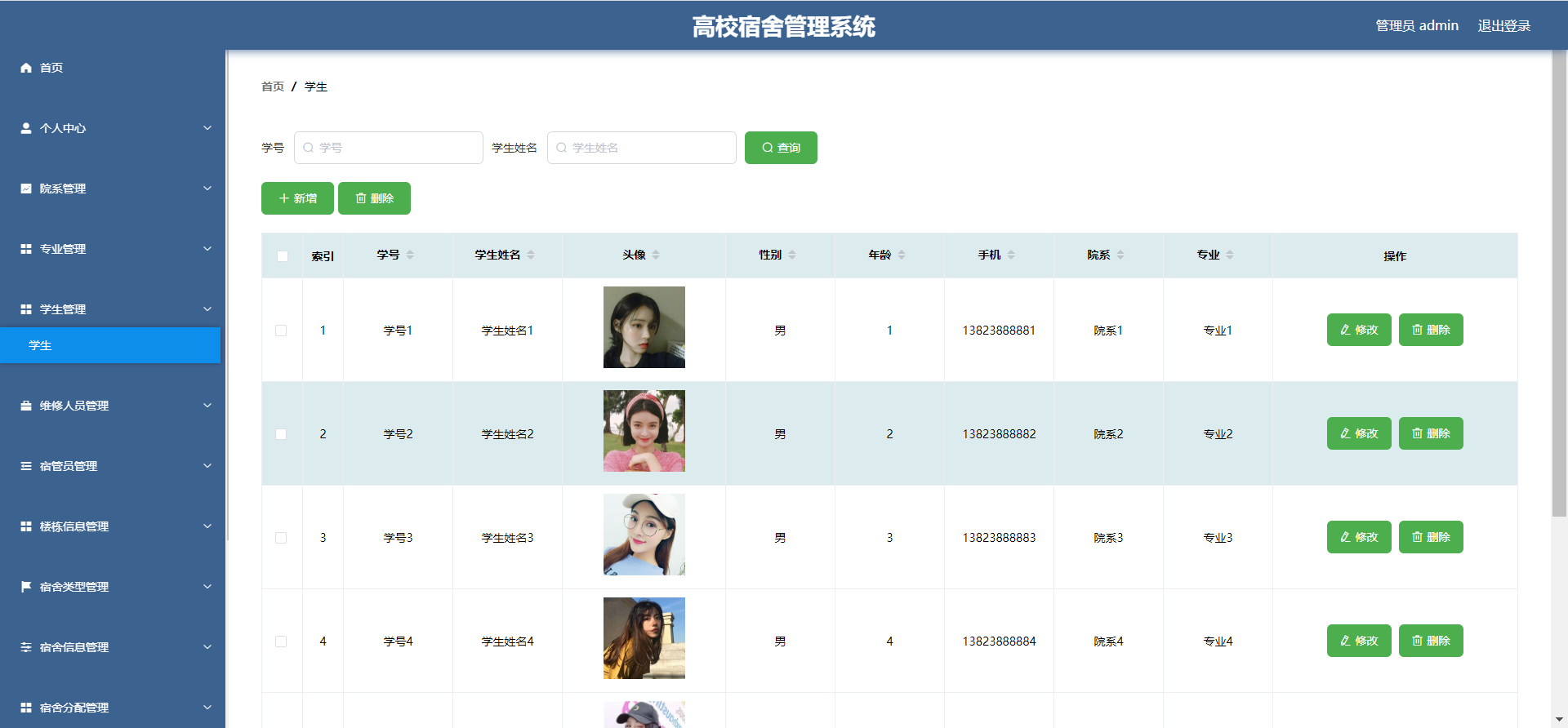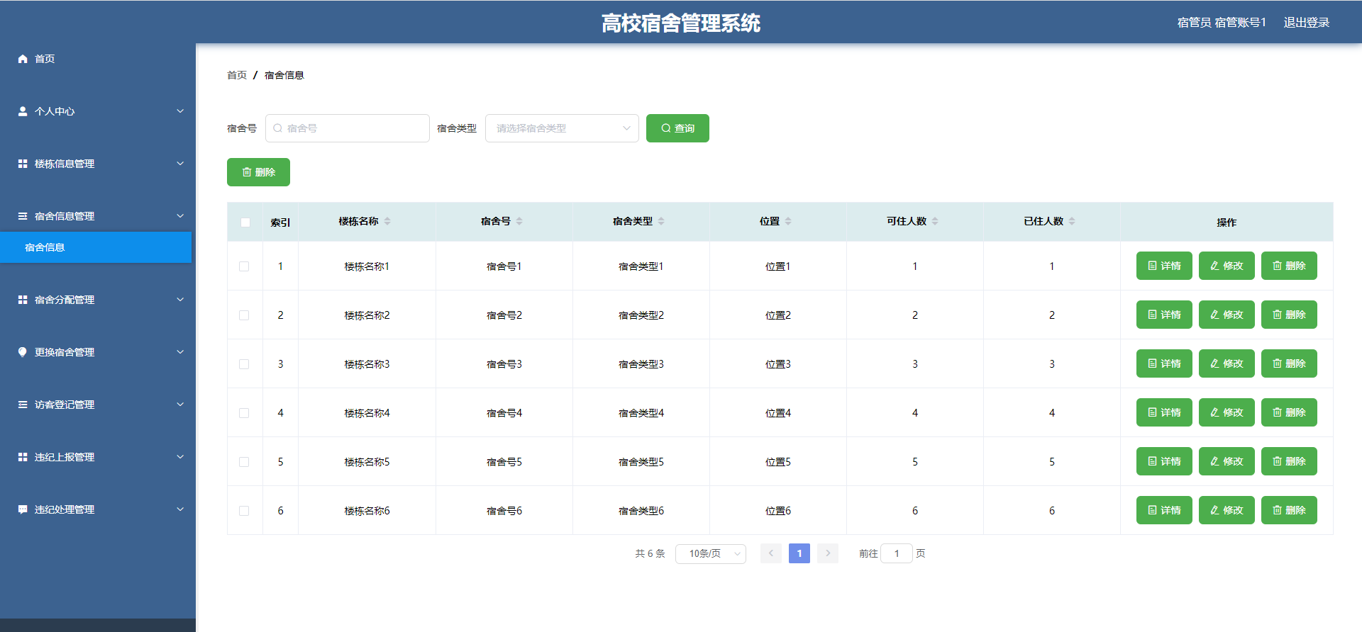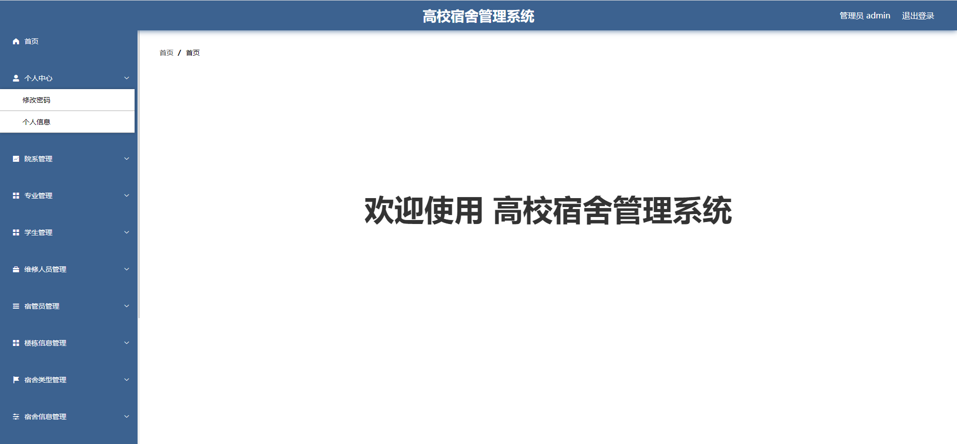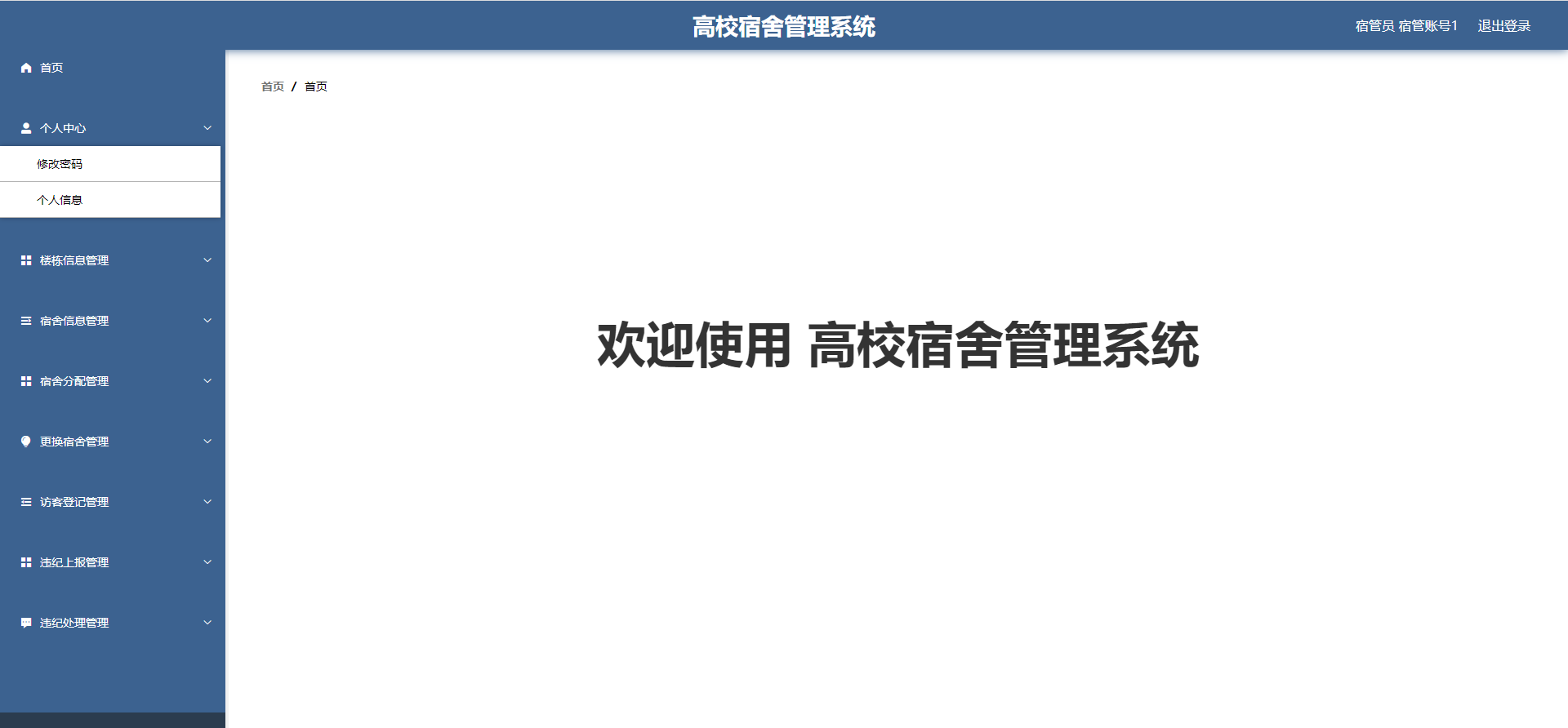 管理员:首页,个人中心,院系管理,专业管理,学生管理,宿管员管理, 楼栋信息管理,宿舍类型管理,宿舍信息管理,宿舍分配管理,更换宿舍管理,访客登记管理,违纪上报管理,违纪处理管理等