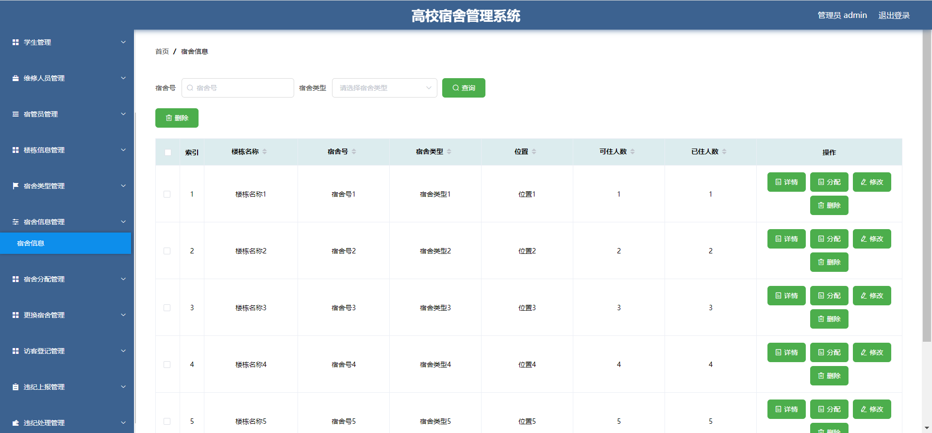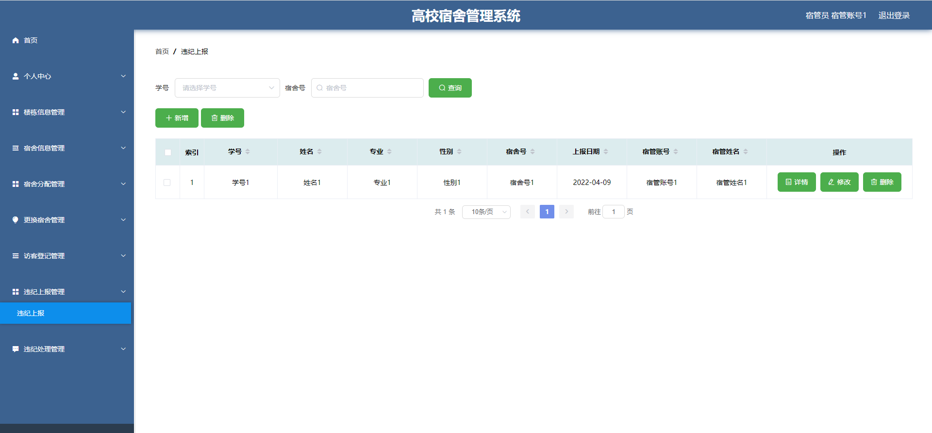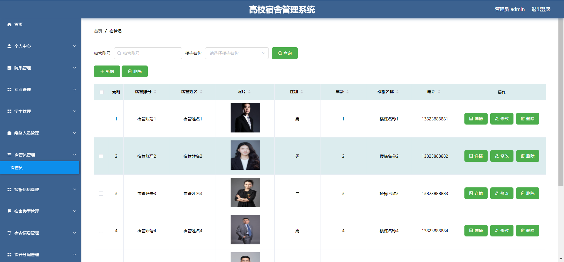 管理员:首页,个人中心,院系管理,专业管理,学生管理,宿管员管理, 楼栋信息管理,宿舍类型管理,宿舍信息管理,宿舍分配管理,更换宿舍管理,访客登记管理,违纪上报管理,违纪处理管理等