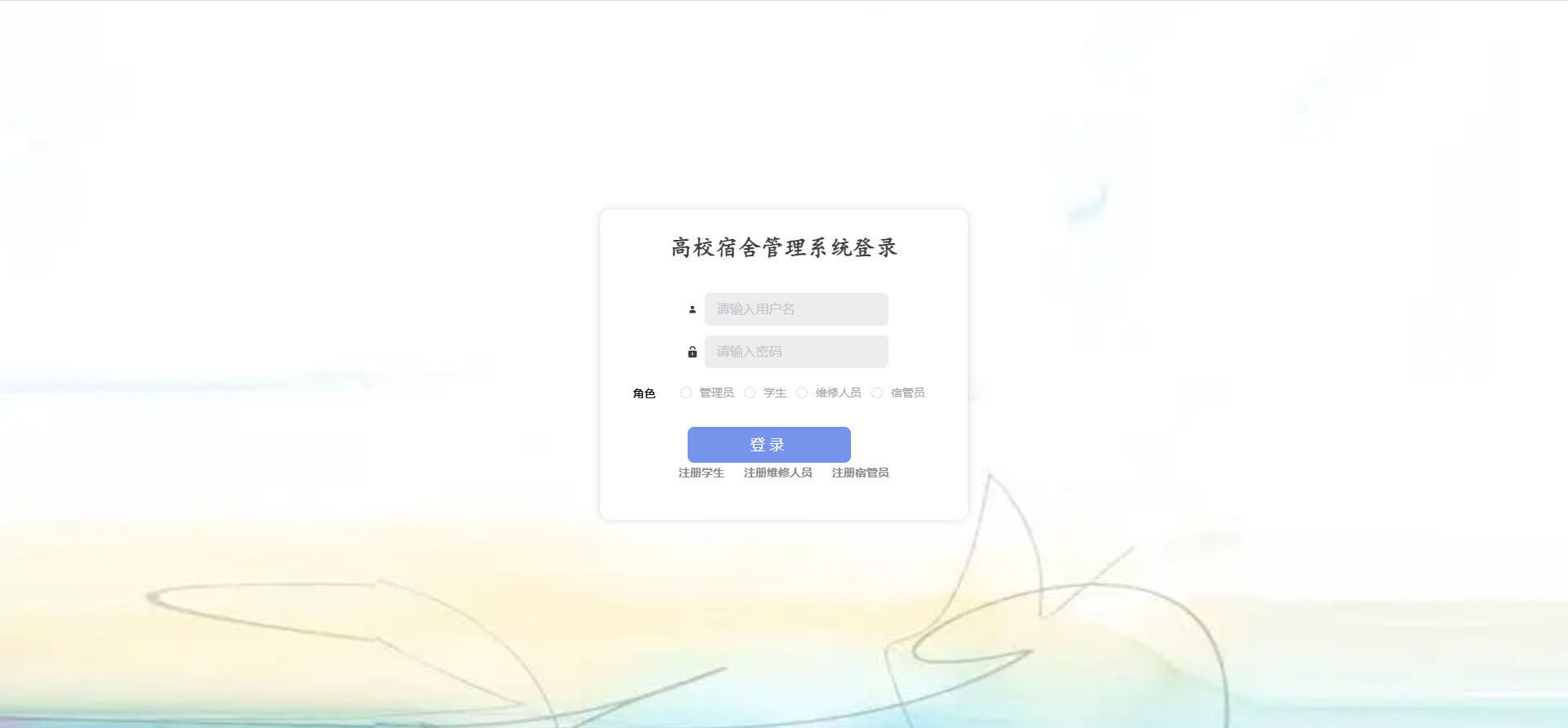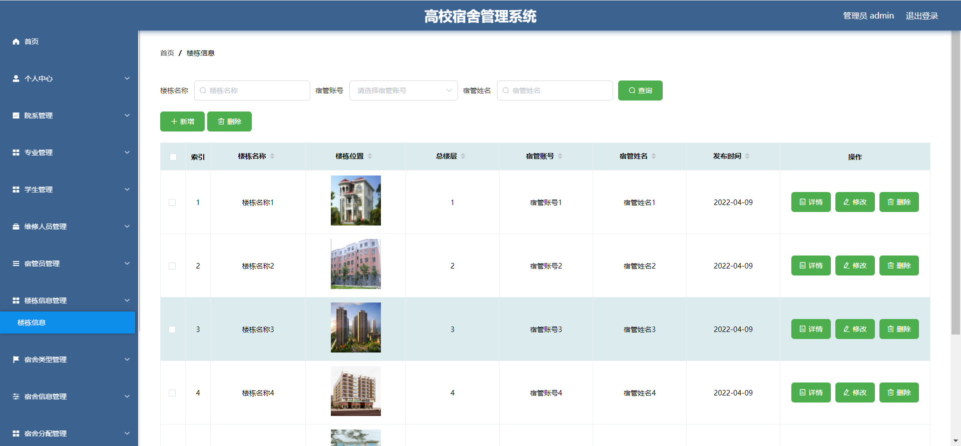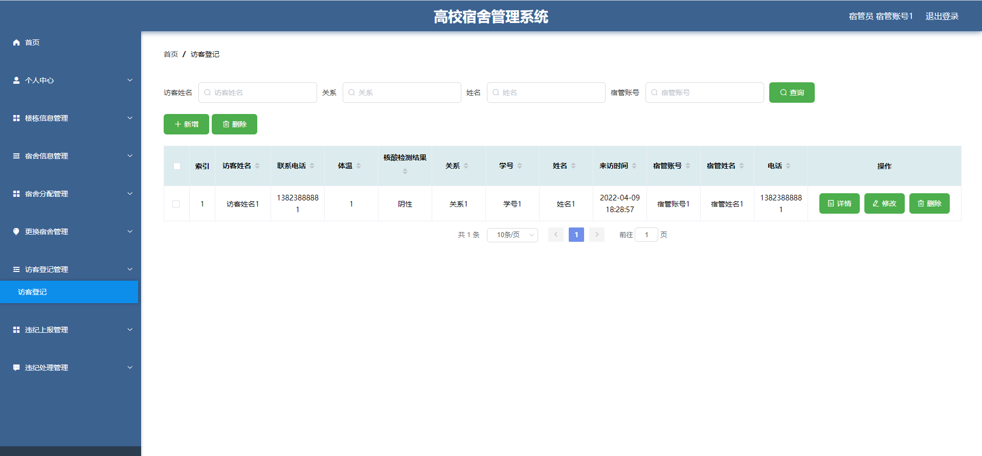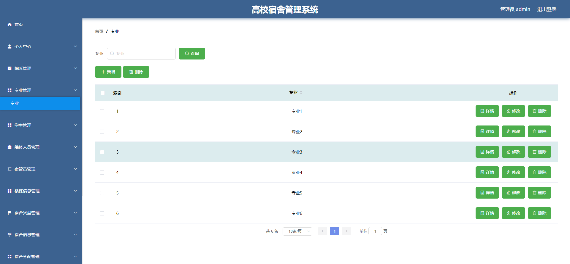 管理员:首页,个人中心,院系管理,专业管理,学生管理,宿管员管理, 楼栋信息管理,宿舍类型管理,宿舍信息管理,宿舍分配管理,更换宿舍管理,访客登记管理,违纪上报管理,违纪处理管理等