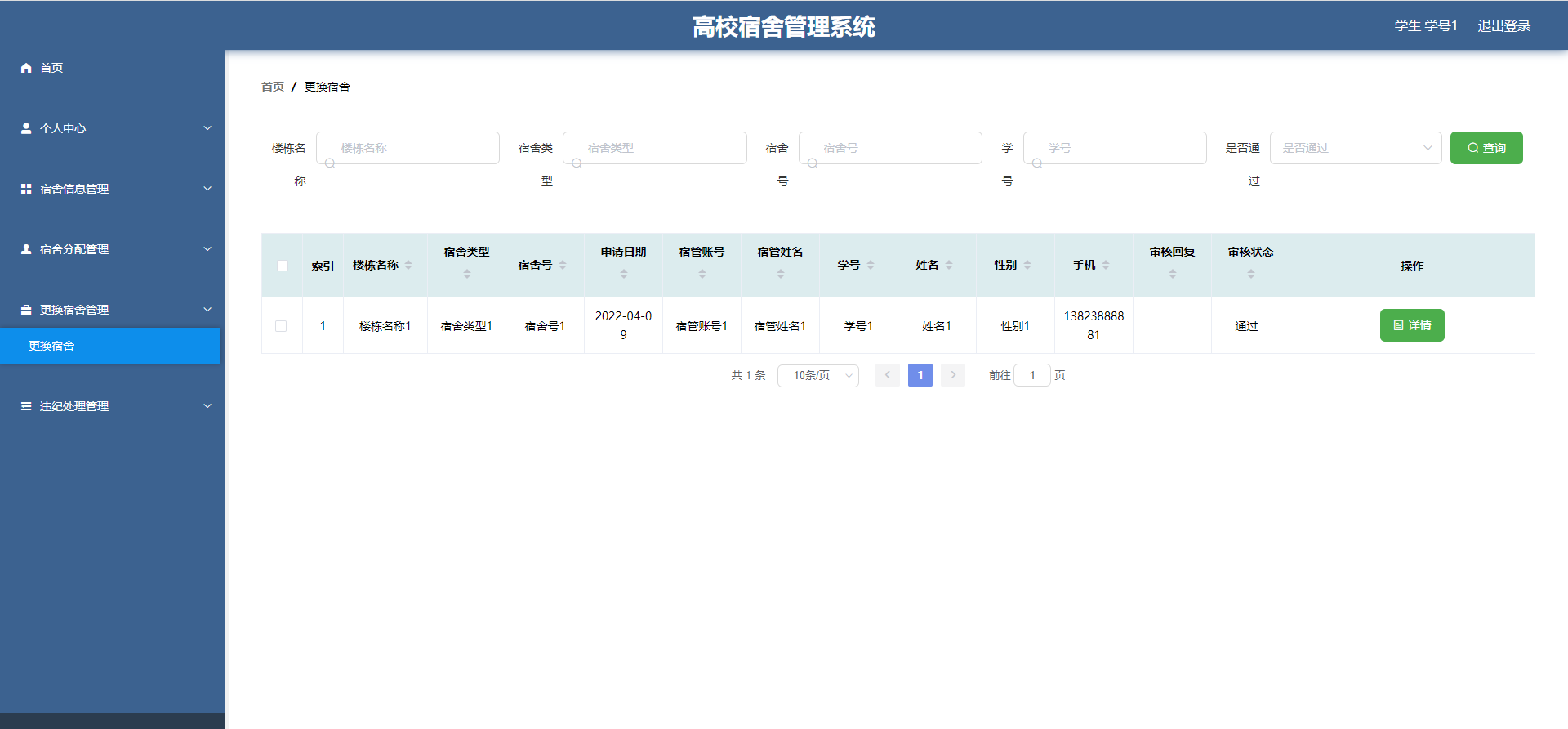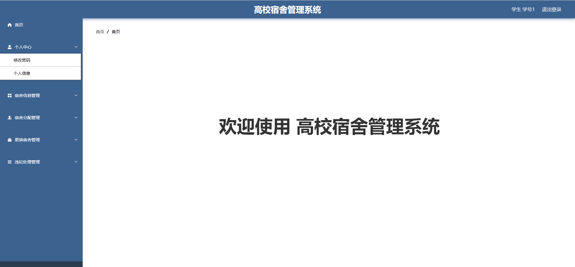 学生:首页,个人中心,宿舍信息管理,宿舍分配管理,更换宿舍管理,违纪处理管理等