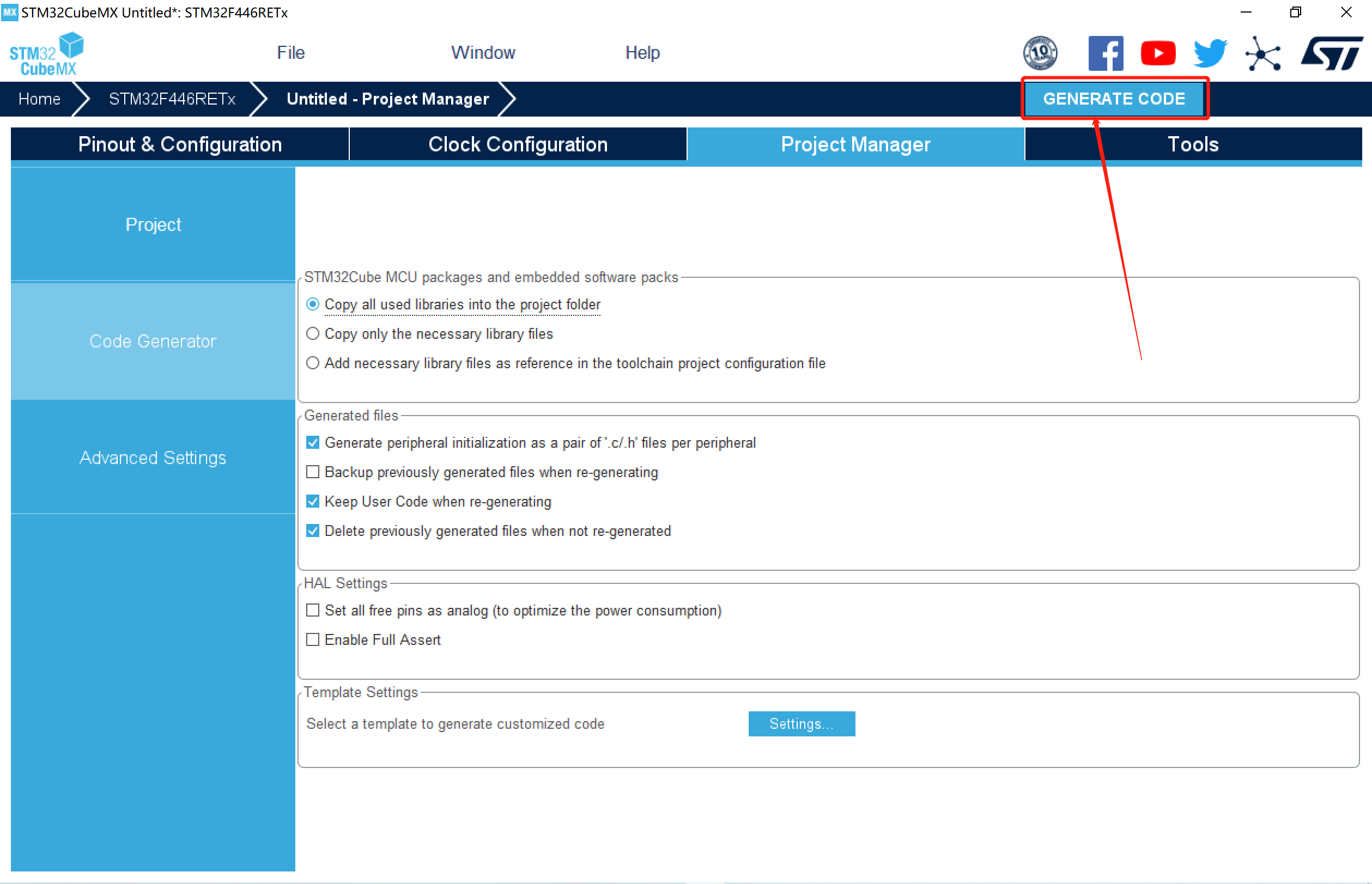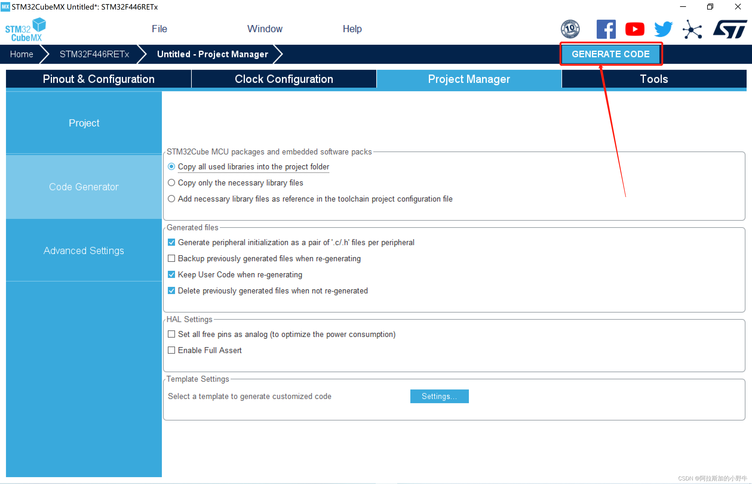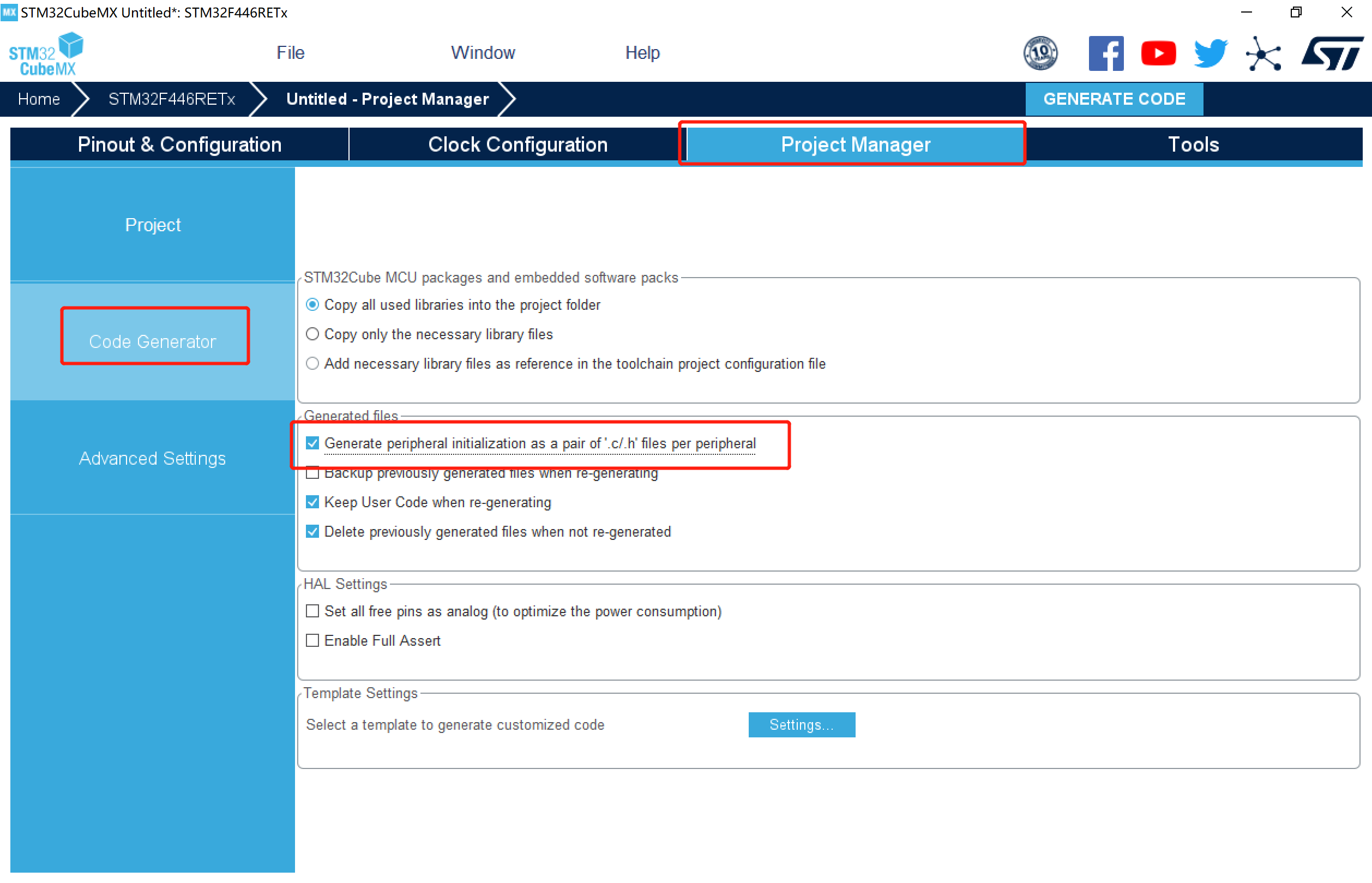 在设置代码,勾选Generate peripheral initialization as a pair of '.c/.h' files per peripheral,主要是将GPIO/UART等外设分别打包一个.c/.h文件。