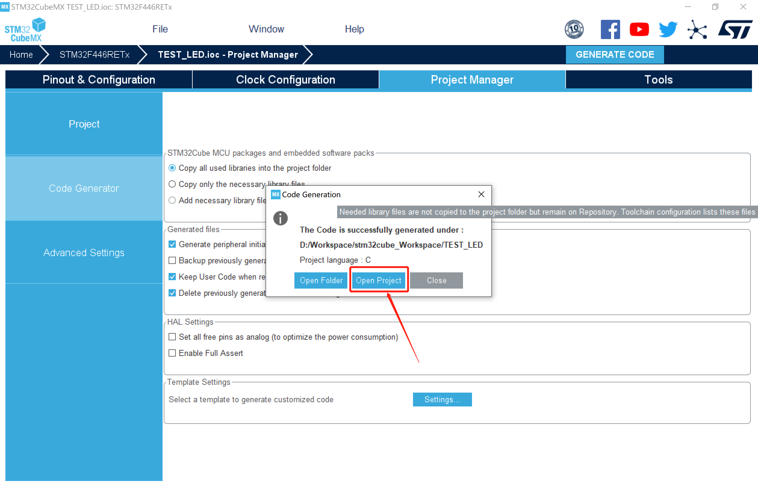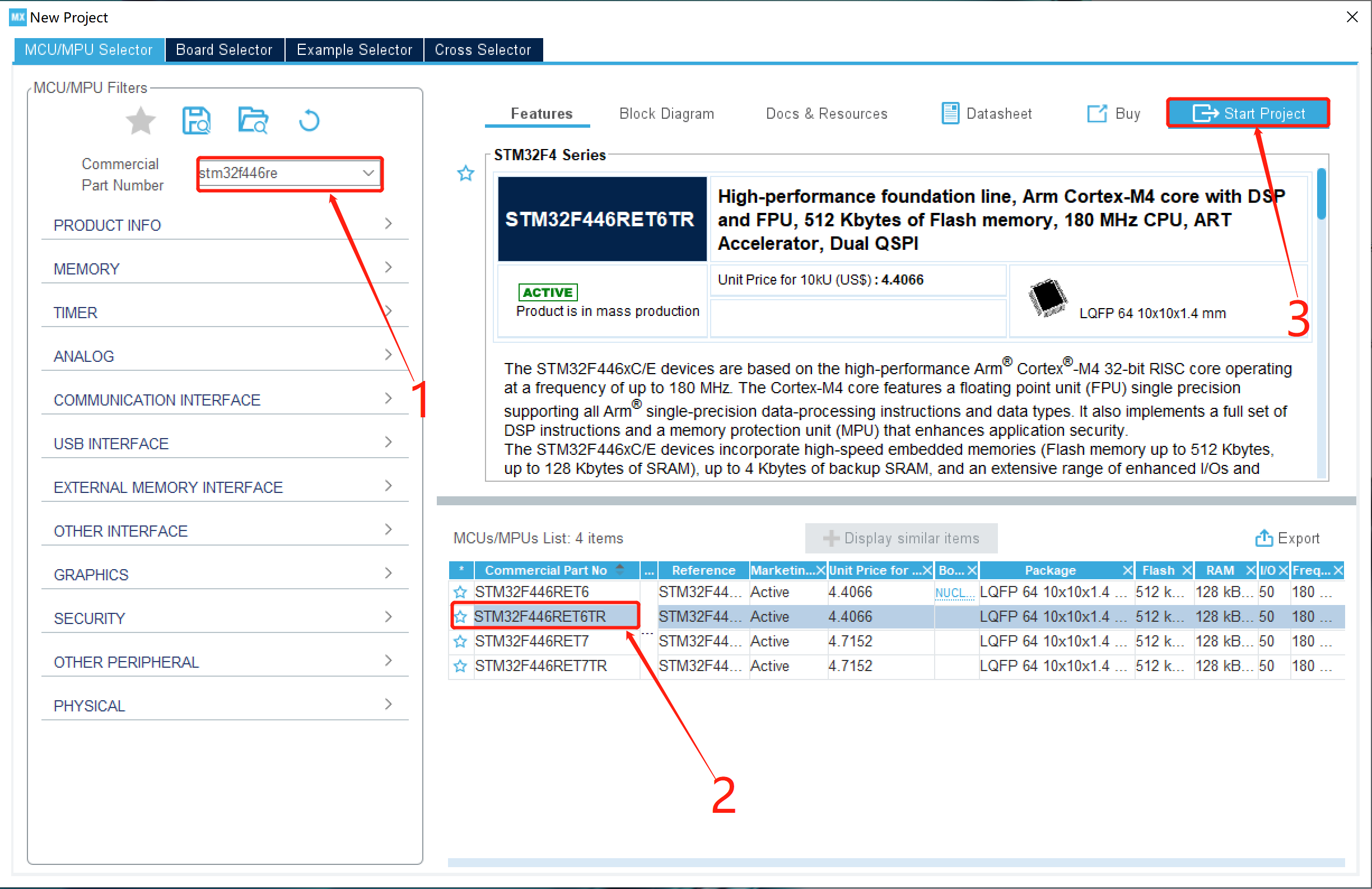 我这里选择的是STM32F446RETR芯片,点击具体芯片,点击Start Project,然后工具会自动打开配置工程