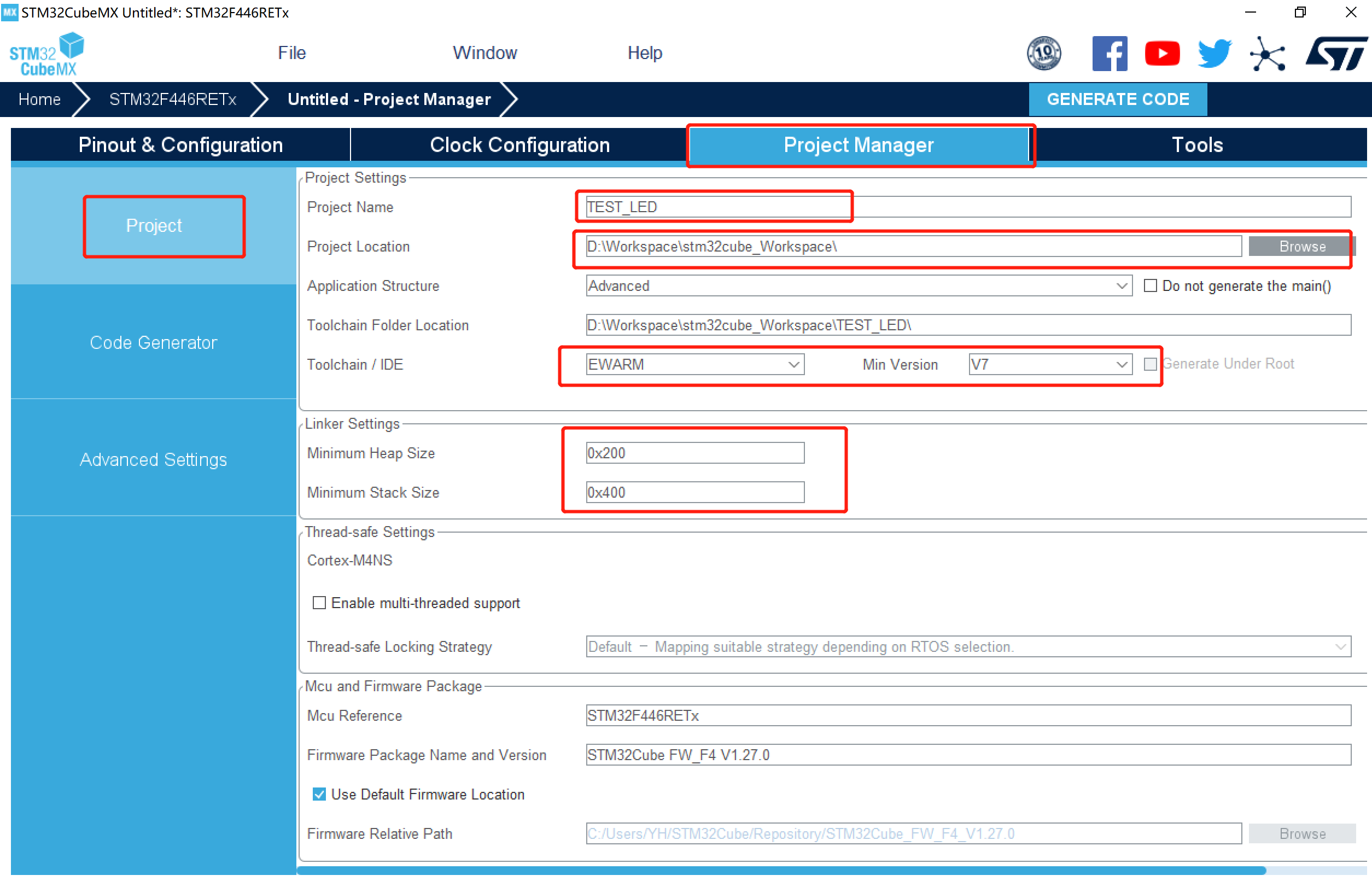 先设置工程名称(Project Name),工程路径(Project Location),选择IDE(主流单片机IDE包括Keil和IAR),我们这里使用IAR编译器,再分配以下堆栈空间大小(按需分配)。