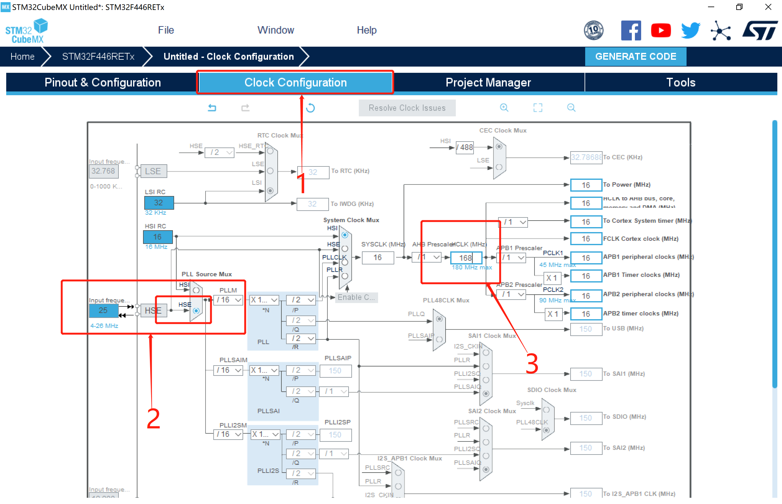 我们使用的是外部25M晶振,先选择HSE(外部晶振),设置为25M,在设置系统时钟168M。
