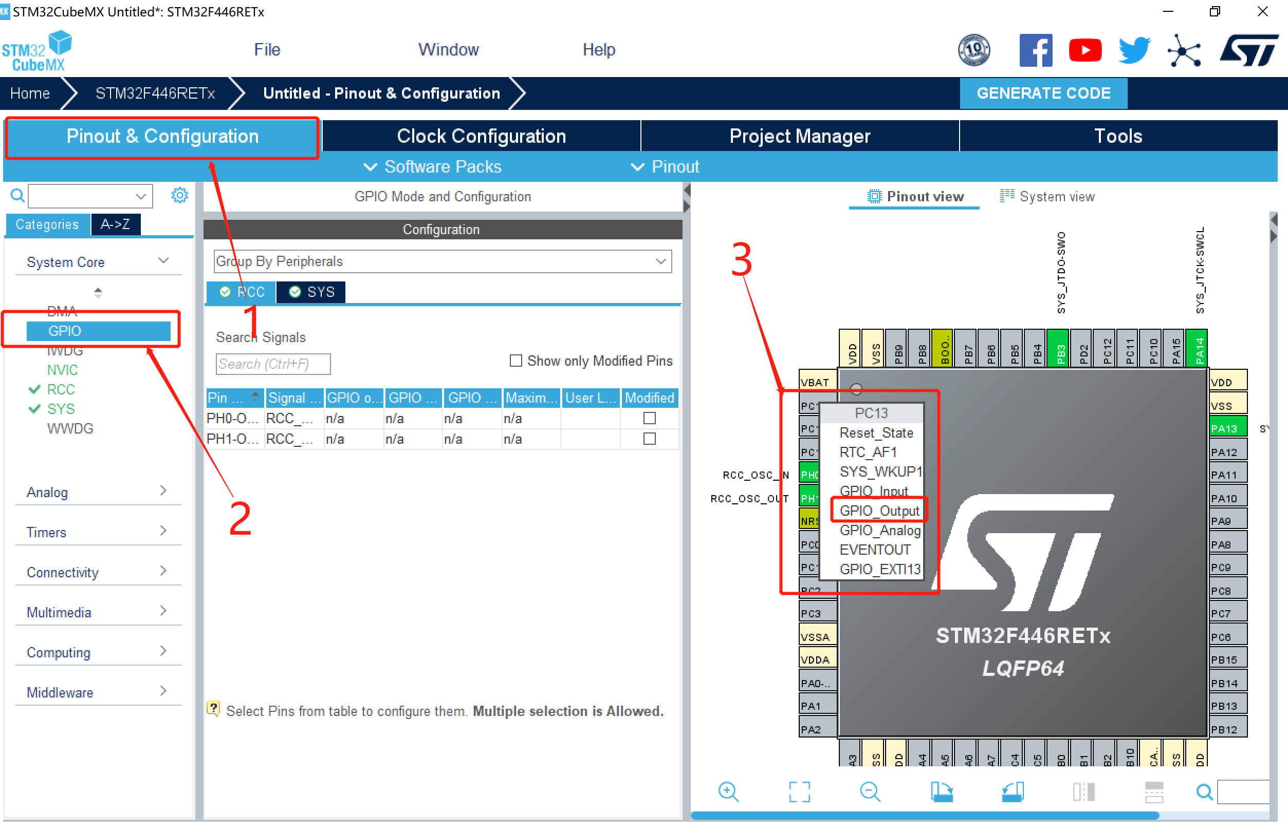 点击Pinout&Confuguration,点击GPIO,在Pinout view中选择对应的引脚,设置为GPIO_Output。