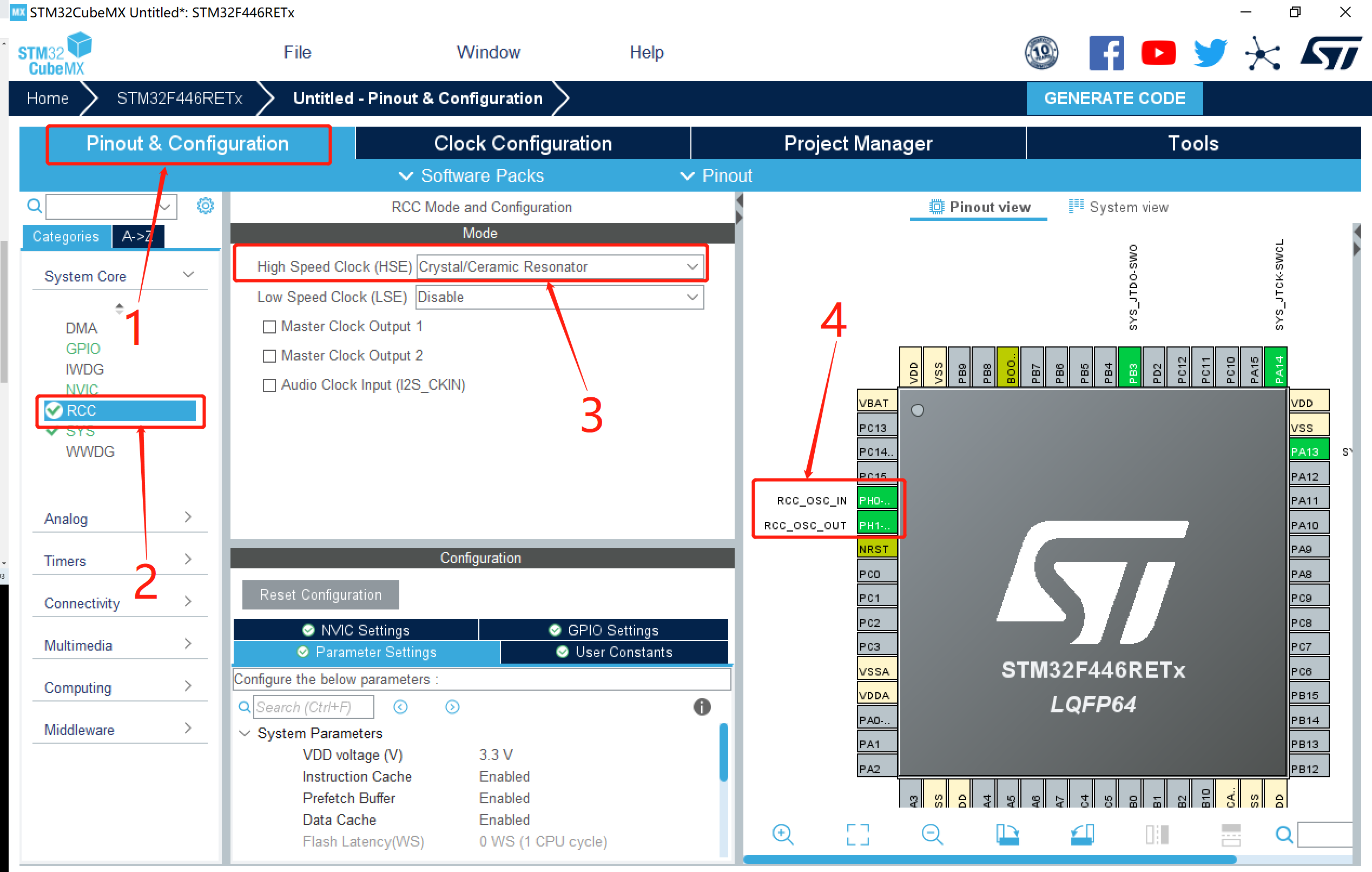 点击Pinout&Confuguration,点击RCC,我们使用的是外部25M晶振,这里选择Crystal/Ceramic Resonator,选个好之后芯片上会自动显示相应的引脚名称。