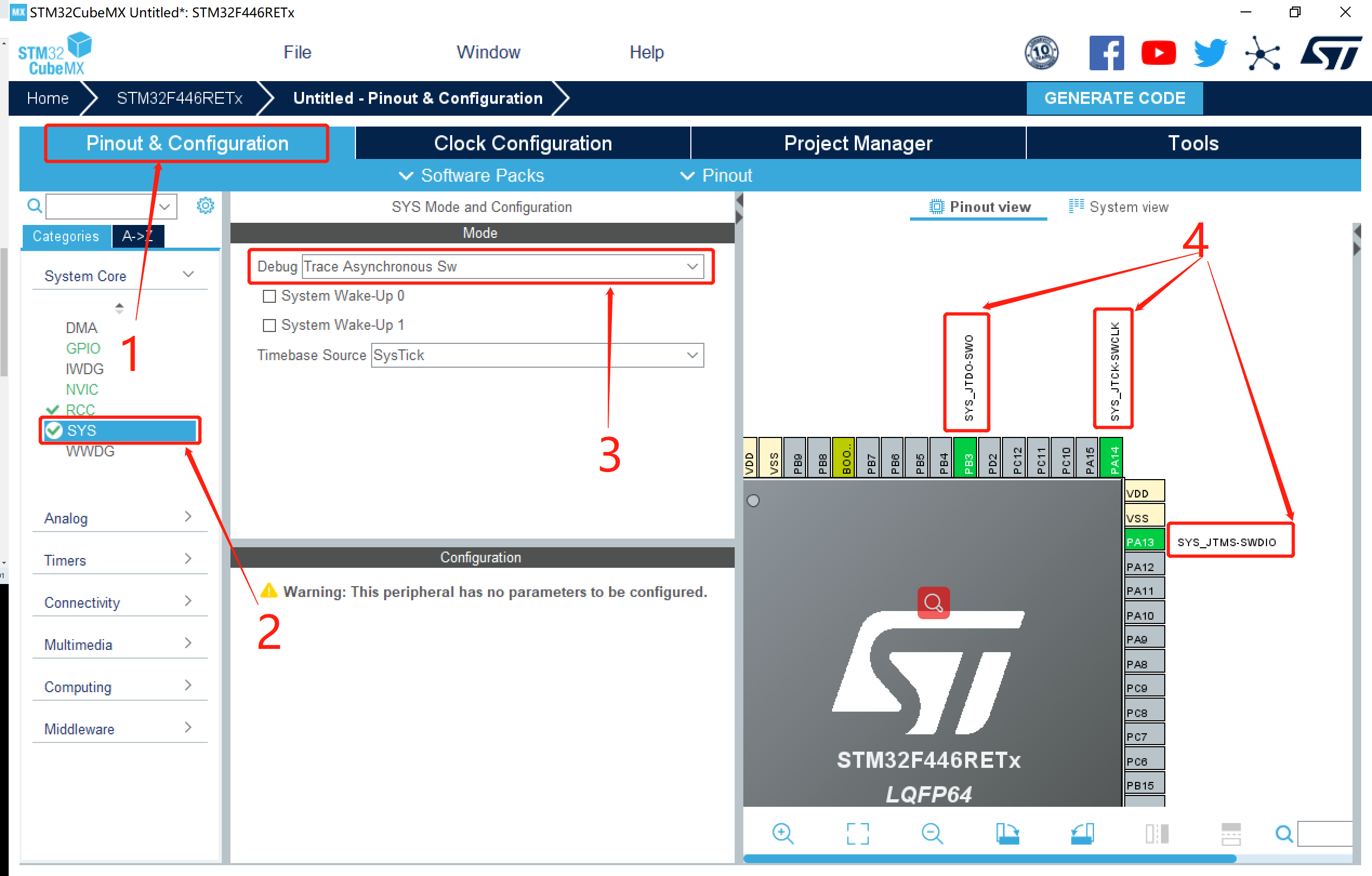 点击Pinout&Confuguration,点击SYS,选择需要Ddbug的接口,主要包括串口/JTAG/SWD三种接口,我们这里使用的是Jlink的SWD接口,选个好之后芯片上会自动显示相应的引脚名称。