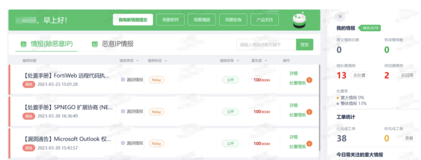 绿盟科技持续监控全网威胁,实时更新安全情报,针对紧急漏洞、威胁事件,云端一键下发情报详情、攻击检测防护规则、事件处置手册,快速更新本地探针检测防护能力,有效提升新型、未知威胁应对效率。