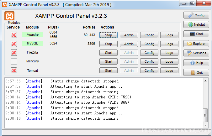 显示如下界面,在你需要的后边点击start,成功之后start转变为stop;当然端口也可以修改,在config中配置端口,还可以在Netstat中查看当前占用的端口和占用端口的服务