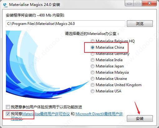 3、默认软件安装路径,选择环境为China,并勾选同意许可协议选项,将改善计划的选项勾选掉,点击安装;
