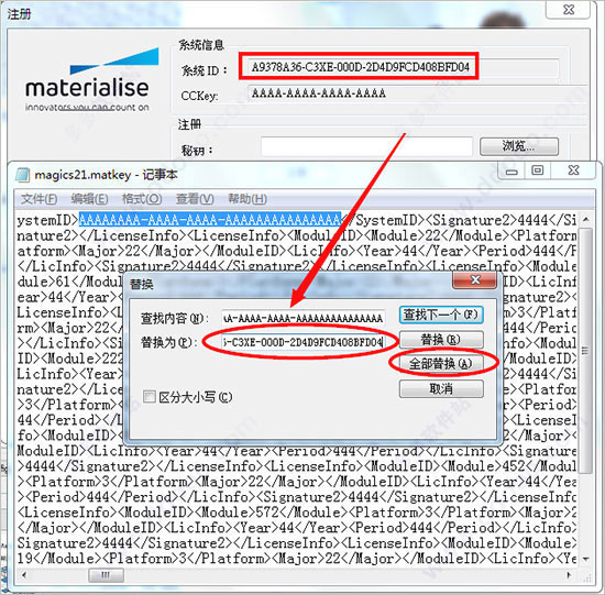14、以记事本方式打开破解文件夹中的magics24.matkey,用您的系统ID替换* .matkey中的“ AAAAAAAA-AAAA-AAAA-AAAAAAAAAAAAAAA”,在magics24.matkey中CTRL+H查找并进行替换,替换完成保存;
