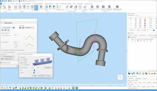 通过Materialise Magics可增加标签,序列号和对零件进行抽壳(自支撑结构抽克),应用纹理,建立点阵结构,进行布尔运算以及进行高级切割等等功能。