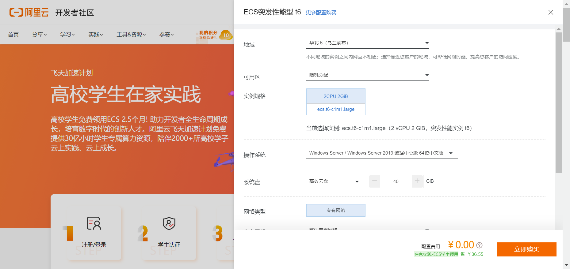 参加计划后,根据网站中的指示进行,完成注册、学生认证、完成一个实验(大概15分钟左右就ok了)和一个测试(很简单,都是基础知识),大概进行到第四步就可以了,此时你就可以领取到2周的免费ECS云服务器。