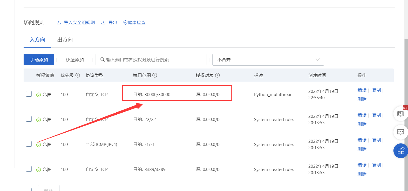 这里贴一篇阿里云的官方教程https://developer.aliyun.com/article/791425,我们这个项目使用的是30000端口,所以只要开放这个端口就可以了,最后开放的效果如下: