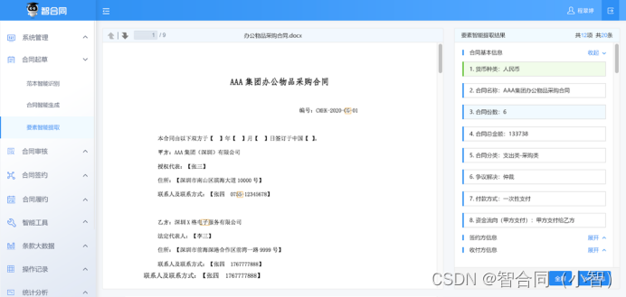 其中有些信息直接影响合同审批流程,但是受经办人工作经验、对合同熟悉程度等主观因素影响,容易出现错误,影响了合同审批工作效率。引入智能化功能后,可以从合同文本中智能抽取这些信息,保证信息的准确性,减少人工失误、提高工作效率。