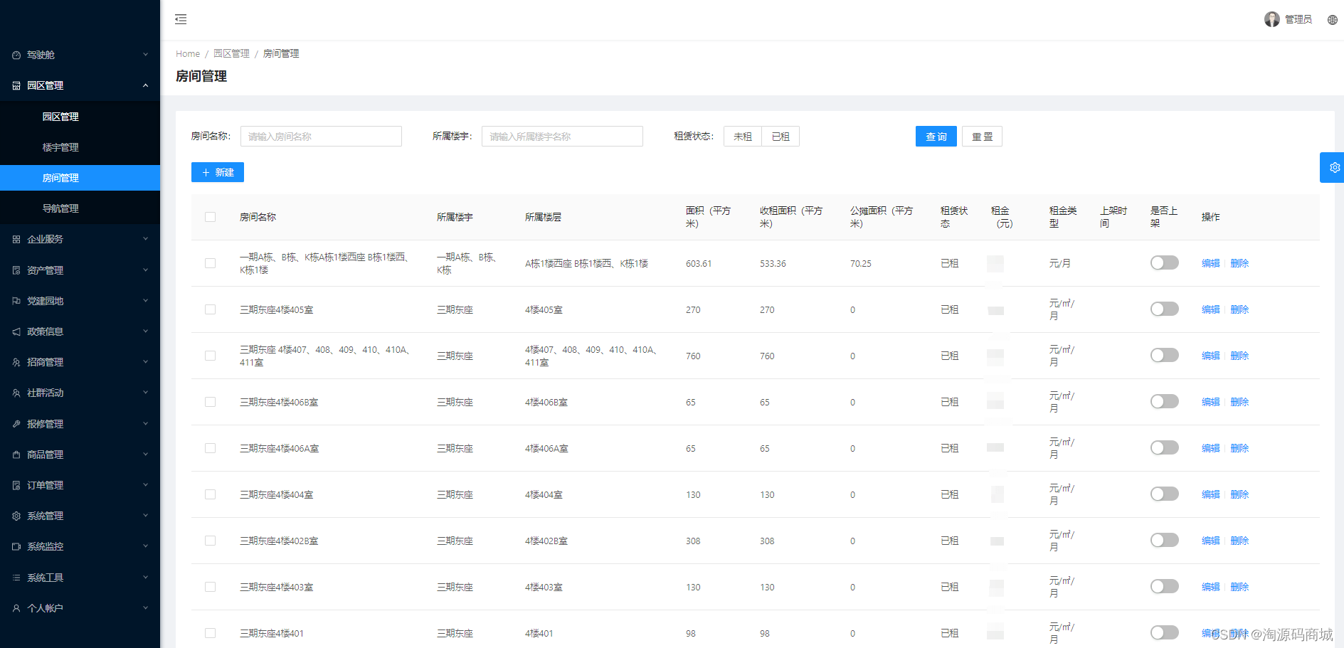 园区列表:该功能主要完成园区基本信息配置,包括园区的总⾯积、园区的总房间、经纬度等基础的配置管理。