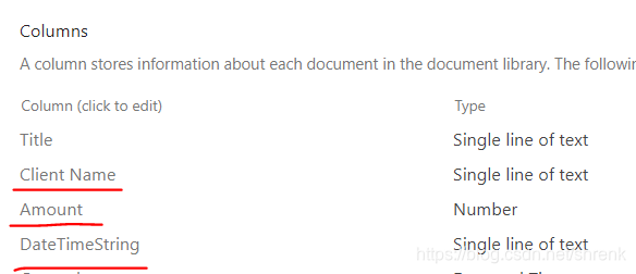首先创建一个Contract文档库,用来保存合同文档,并且添加如下字段,其中Client Name是乙方名字,Amount是金额,DateTimeString是日期字符串: