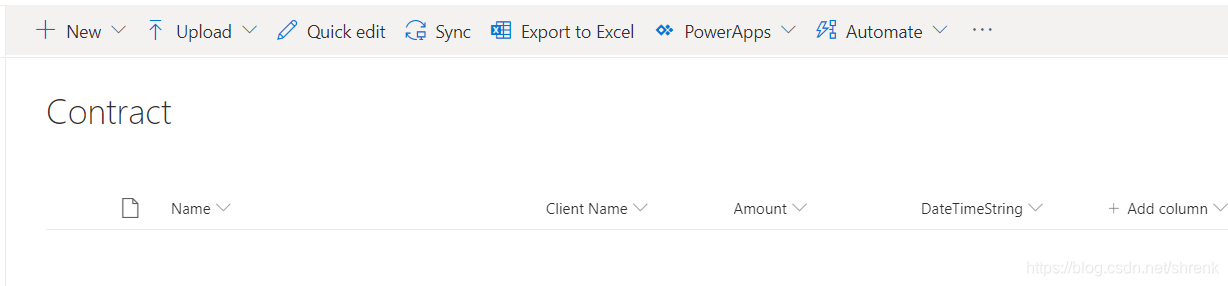 目前合同文档的生成还是手动的,下面我们使用Power Automate自动化这个过程。我们先创建一个Contract List,这个列表也包含Client Name, Amount和DateTimeString这三个字段,用来触发Power Automate工作流。这样每当在这个列表中创建一个新的item的时候,就会启动工作流,工作流根据item的各个字段的值,在前面的Contract文档库中创建一个合同文档。