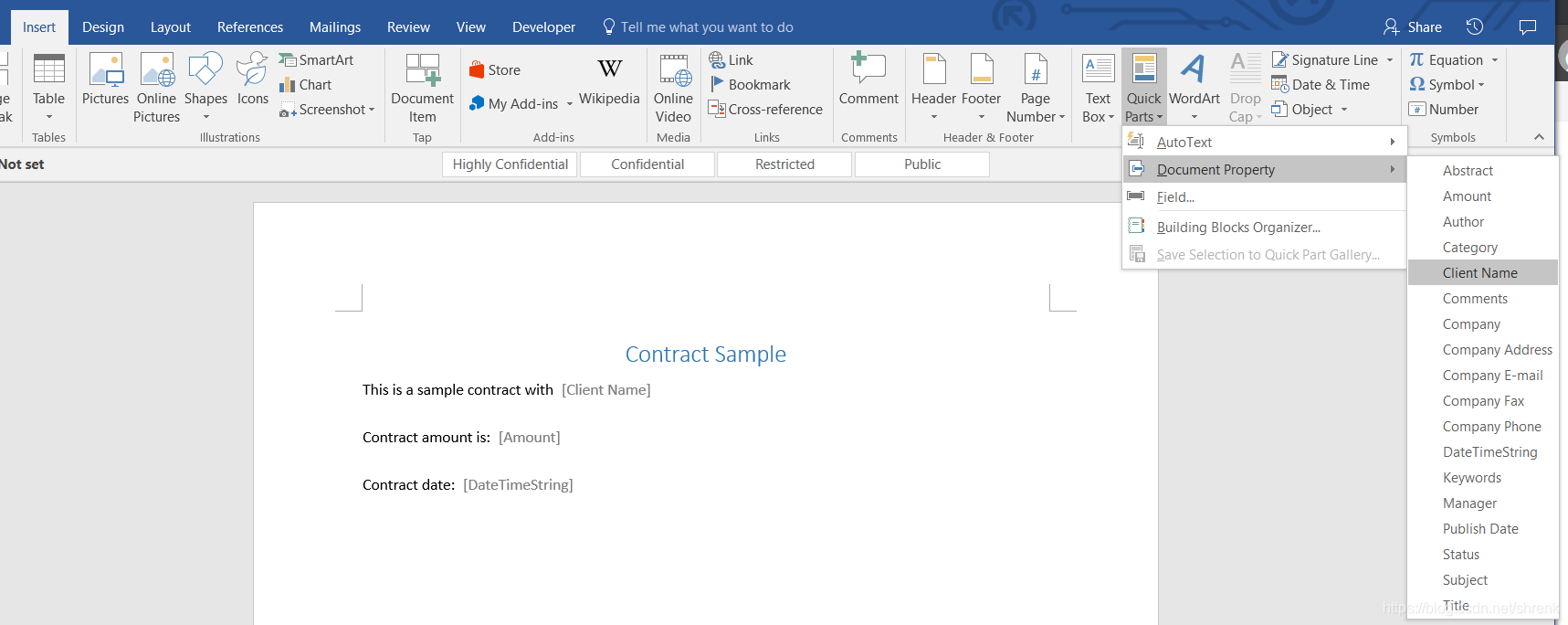 在打开的文档中(这里推荐Edge浏览器),选择”Insert“, 然后”Quick Part“,”Document Properties", 找到Client Name, Amout和DateTimeString,插入到文档模板中合适的位置: