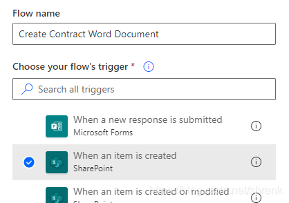 输入工作流的名字,并选择SharePoint的“When an item is created”触发器,每当创建新的item的时候触发工作流。