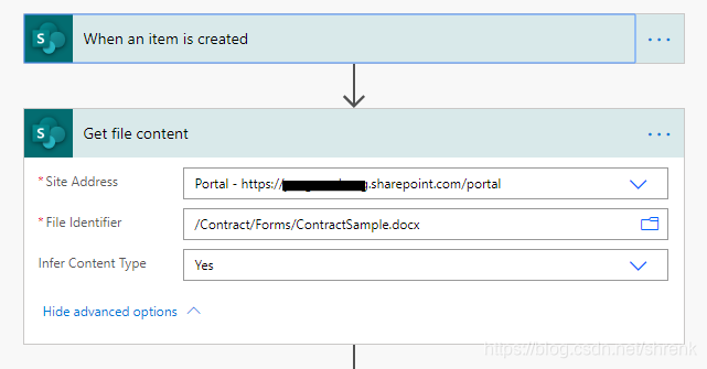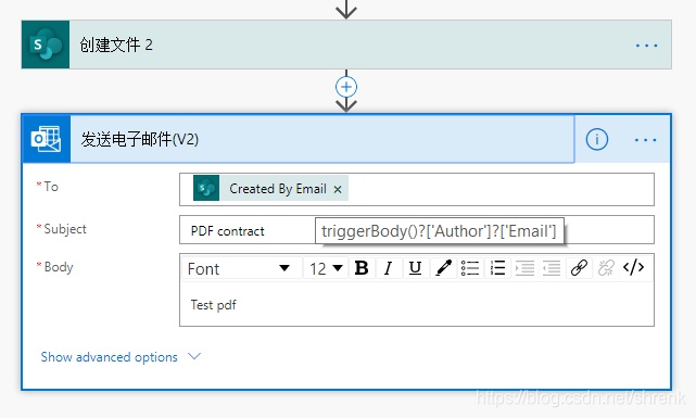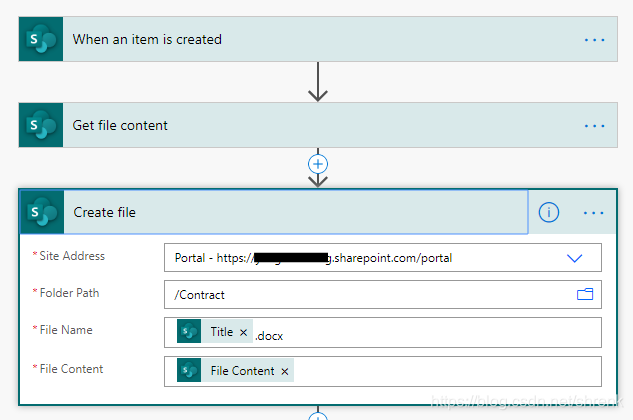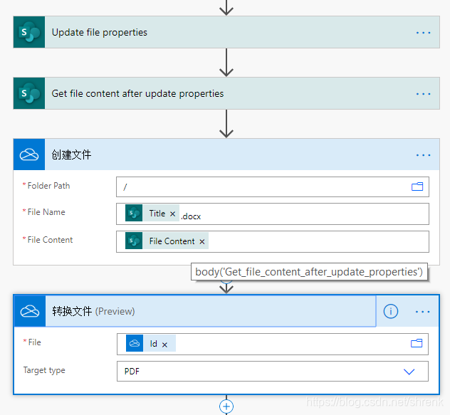 3,根据模板创建文档,并把新建的文档保存到Contract文档库,其中文档名(File Name)的值使用的是触发工作流的item的Title,文件内容(File Content)的值是上一步”Get file content“的输出。如果把鼠标放到Title上,会出现”triggerBody()?['title]”,把鼠标放到File Content上会出现“body(Get_file_content)”。这里不要选错。