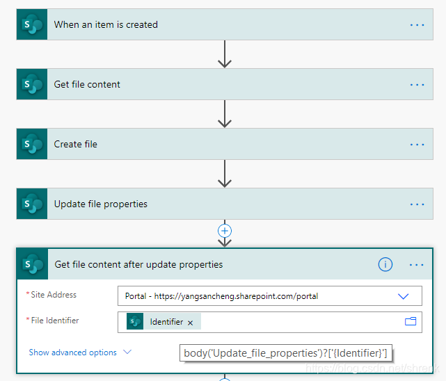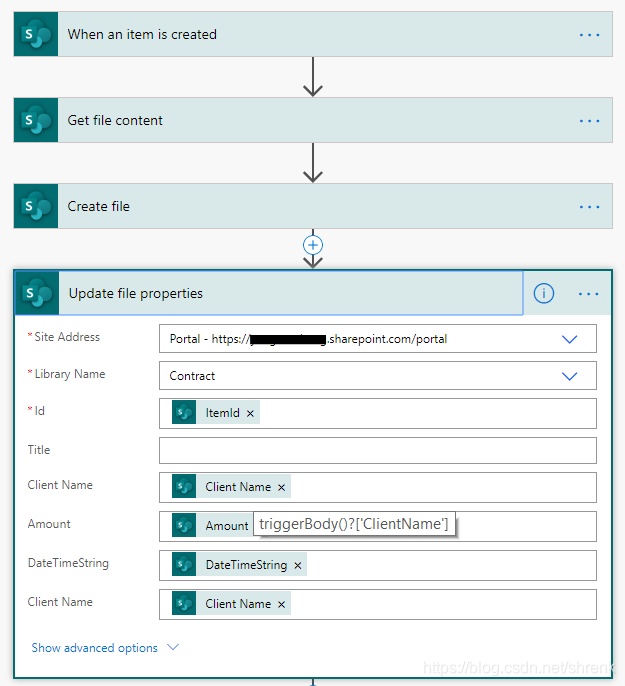 4,使用触发工作流的item的数据,更新文档库中文档的属性字段,其中ItemId是上一步Create file的输出,当鼠标放到“ItemId”之上的时候会出现"body('Create_file')?['ItemID]",而其他数据例如Client Name等,都是使用触发工作流的item中的数据: