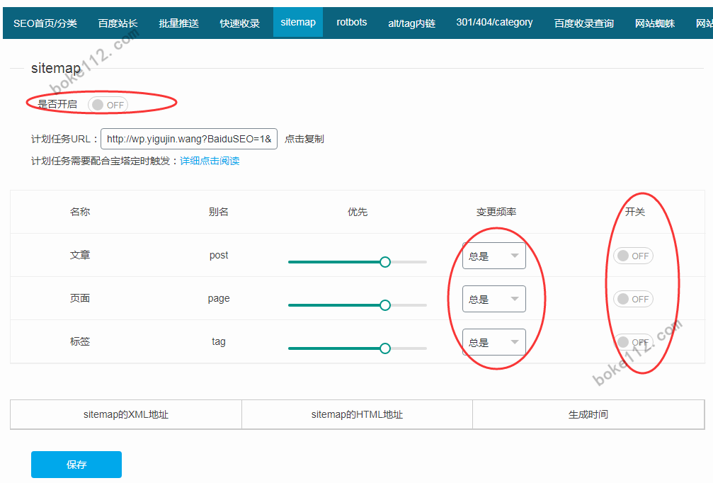 3、比如点击“sitemap”可以开启自动生成百度地图,还可以自行选择文章、页面、标签等是否在地图中显示等。
