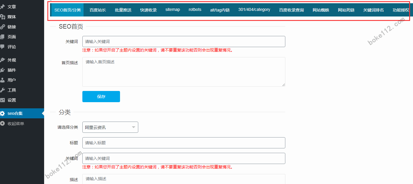 1、登录 WordPress 站点后台 >> 点击左侧导航菜单“SEO 合集”即可看到该插件所包含的优化功能,比如 SEO 首页/分类、百度站长、批量推送、快速收录、sitemap、百度收录查询、网站死链、关键词排名等,点击任何一个功能即可进入到具体的设置页面。