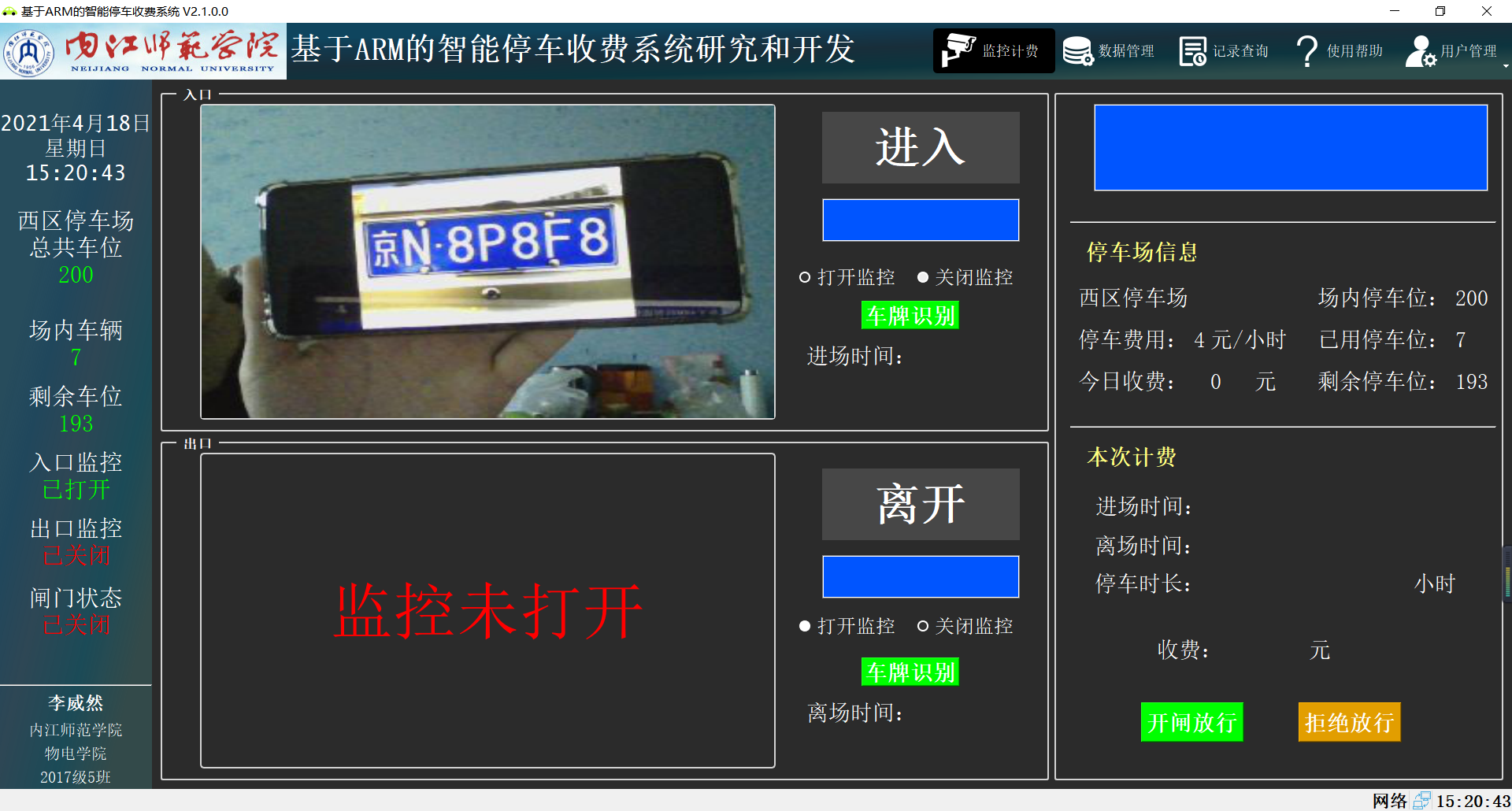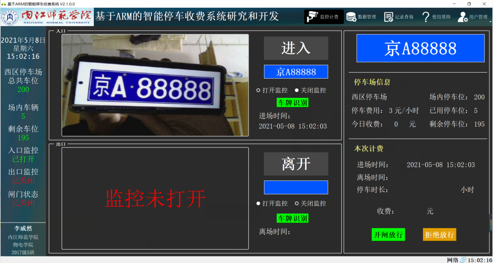 在上位机软件中打开出口的摄像头,接收视频画面,视频显示正常点击车牌识别按钮车牌识别正常,出库时间、收费计算及车位数量等都计算无误,闸门打开正常。