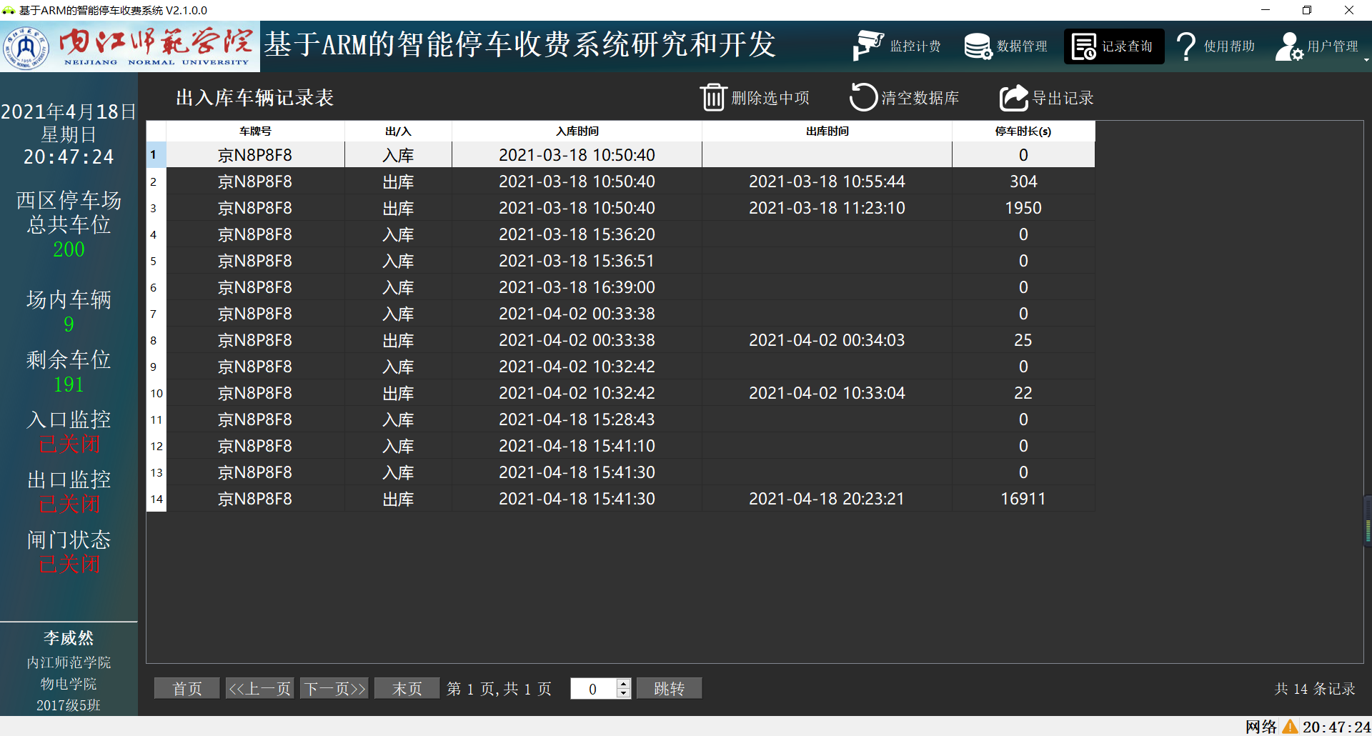 在“记录查询”页面可以查看车辆出入库的记录,通过数据库记录了所有出入库车辆的车牌号、出入库状态、出入库时间及停车时长,分页逐条显示。可以点击相应按钮跳转页面,也可删除选择项及清空数据库。