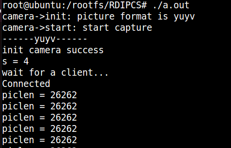 在Linux系统中运行服务器代码,如如5.1.1所示,摄像头初始成功,服务器初始化成功,等待客户端连接。