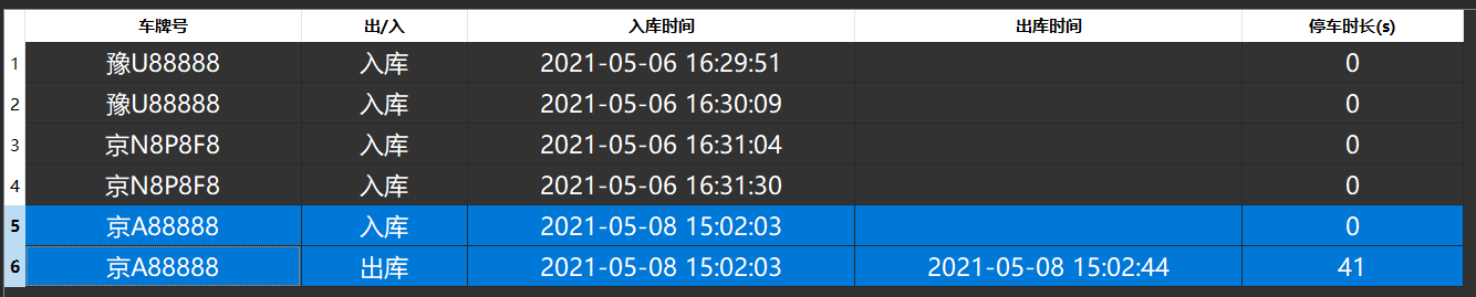 在经过入库及出库测试后,在上位机的记录查询界面可以看到刚才的出入库记录,车牌号及出入库时间等相关信息均无误。
