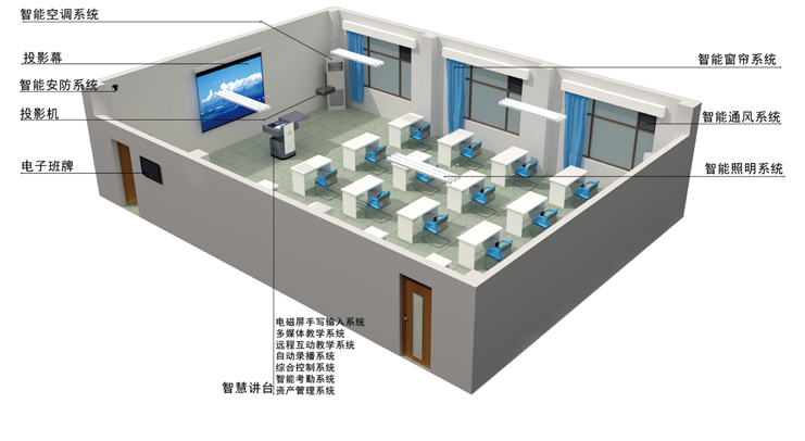 智能教室是数字教室和未来教室的一种形式,基于物联网技术集智慧教学、人员考勤、资产管理、环境智慧调节、视频监控及远程控制于一体的新型现代化智能教室系统。智能教室系统能够方便对教室所装备的视听、计算机、投影、交互白板、电灯、空调等设备进行控制和操作,有利于师生利用各种资源从事教学活动,并能适应包括远程教学在内的多种学习方式。