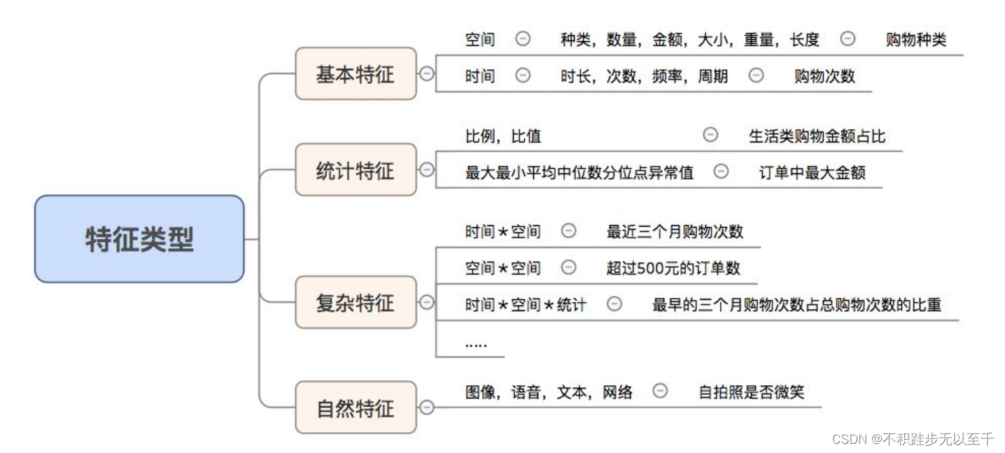 特征分为四类:基本特征,复杂特征,统计特征和自然特征。首先是基本特征,而后统计和复杂特征层层递进,至于图像语音等抽提特征有专用的知识方法。
