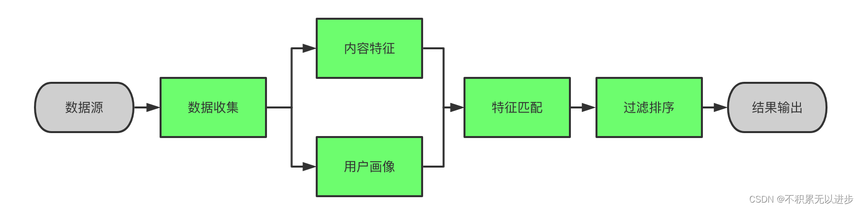 推荐系统经历了数据收集、特征抽取、特征计算、结果排序、前端调用五个环节。