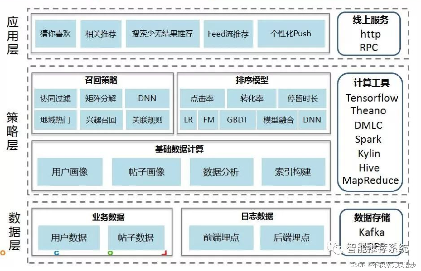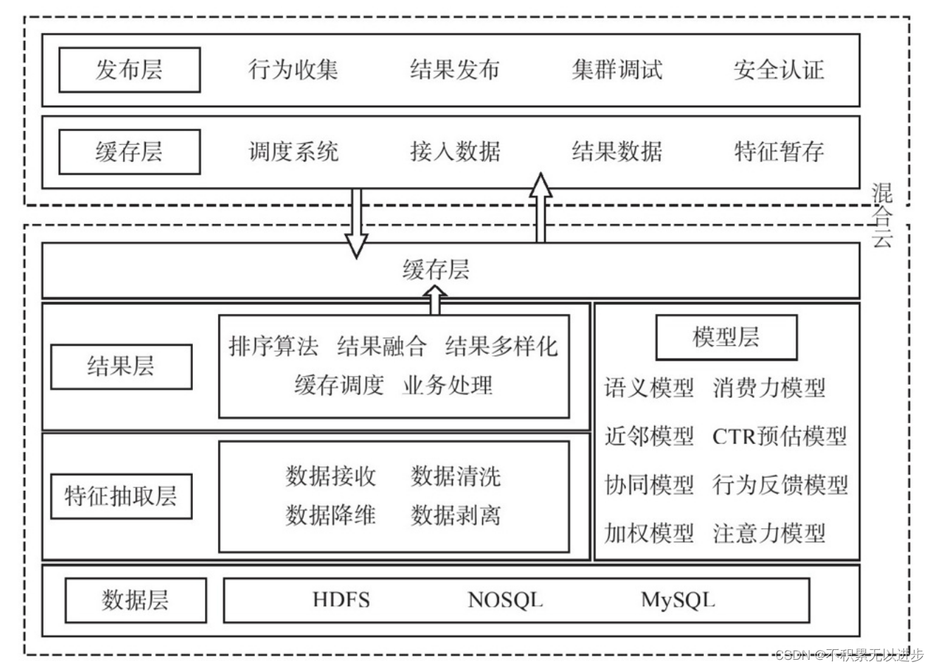 推荐系统主要由四个部分组成,分别是大数据层、特征抽取层、模型计算层、结果发布层。