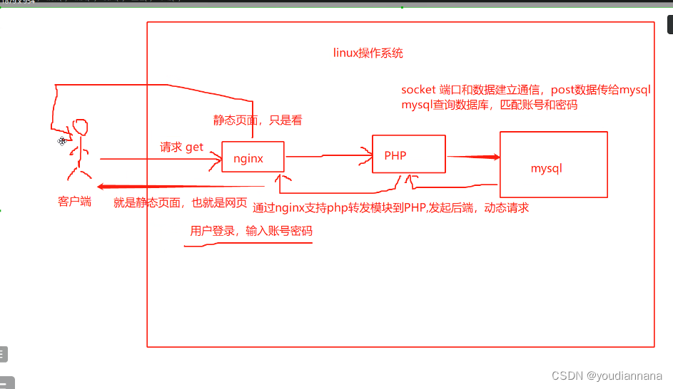 这是个缩写 L Linux系统,操作系统、N nginx网站服务,前端,提供前端的静态页面服务,同时具有代理,转发的作用,转发后端请求,转发到php,nginx没有处理动态资源的功能,他有可以支持转发动态请求的模块 M mysql关系型数据库,保存用户的账号和密码 p PHP 动态页面的编程语言,负责解释动态页面文件,和nginx以及数据库协同工作,PHP的主要作用就是web开发,前端开发
